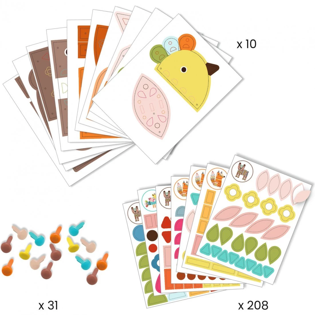Créez et décorez trois grands animaux : l’ours (50 cm), le renard (40 cm) et l’oiseau (28 cm). Grâce aux autocollants et au livret de modèles, l’enfant personnalise chaque personnage, puis les assemble avec des attaches parisiennes. Une activité créative et amusante qui stimule la motricité et l’imagination !