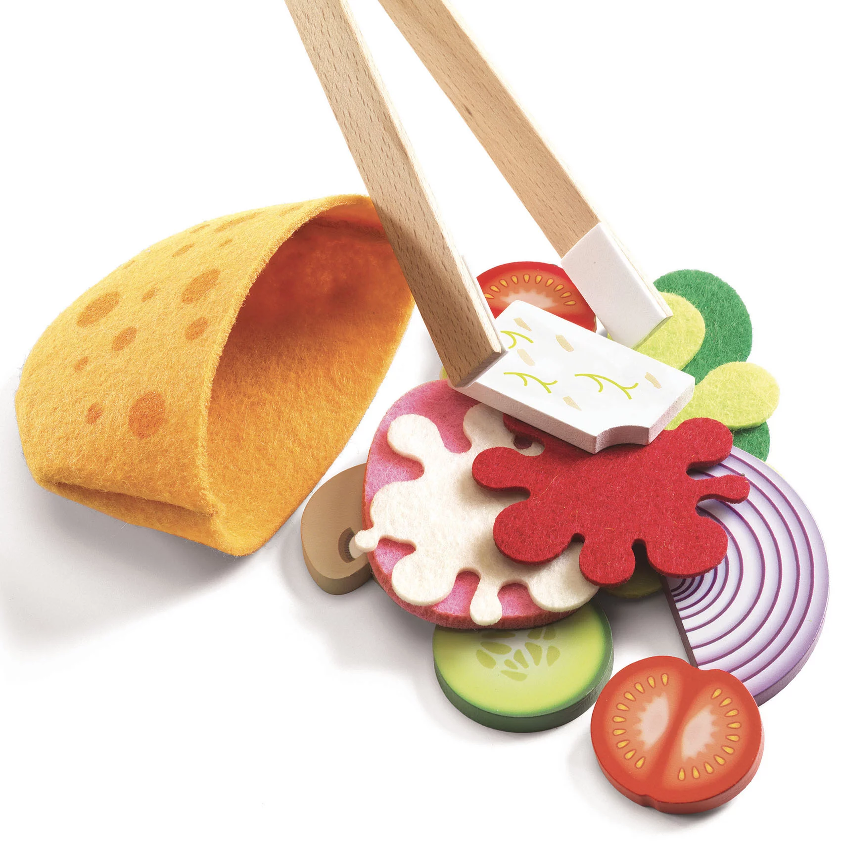 Contenu : 2 pitas à garnir et 9 pièces en feutrine (4 salades, 1 jambon, 1 ketchup, 1 mayonnaise, 2 pitas), 8 pièces, 1 pince, 1 menu et 1 boîte en bois.