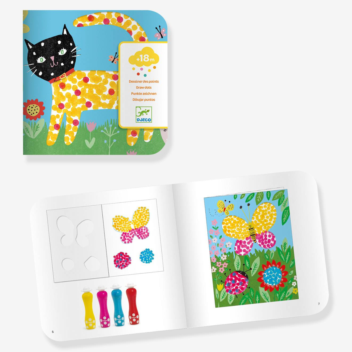 Un chat, une tortue, un papillon et un arbre à colorer de points rouge, bleu, rose ou jaune. Des crayons parfaits pour réaliser des graphismes colorés. Le petit plus ? L’encre lavable lui assure de ne pas salir ses vêtements !