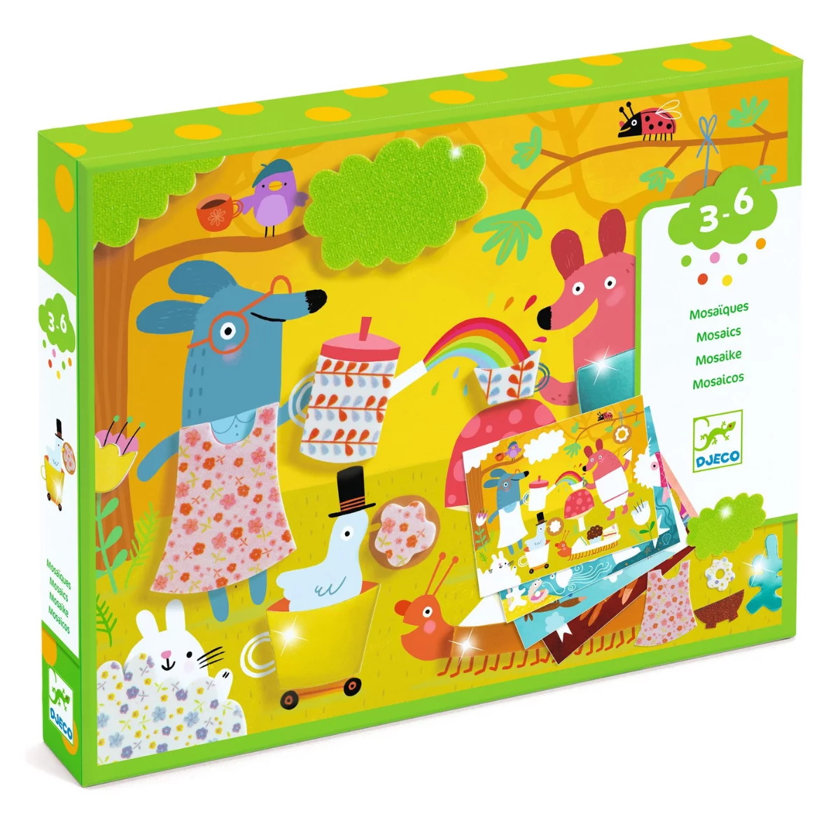 Une activité de collage pour réaliser 4 tableaux avec des mousses autocollantes imprimées, pailletées et métallisées. Une initiation à la mosaïque, où l’enfant on colle de jolies formes en mousse sur des illustrations vraiment drôles.