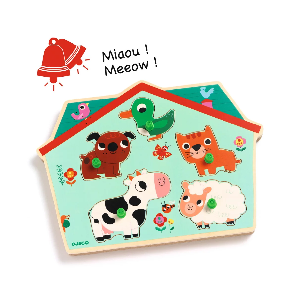 Ouaf Woof est un puzzle d’encastrement sonore en bois sur le thème de la ferme. Wouf, Miaou, Coin-coin, Bê-bê, Meuh ! L’enfant remet chaque animal à sa place pour découvrir son cri.