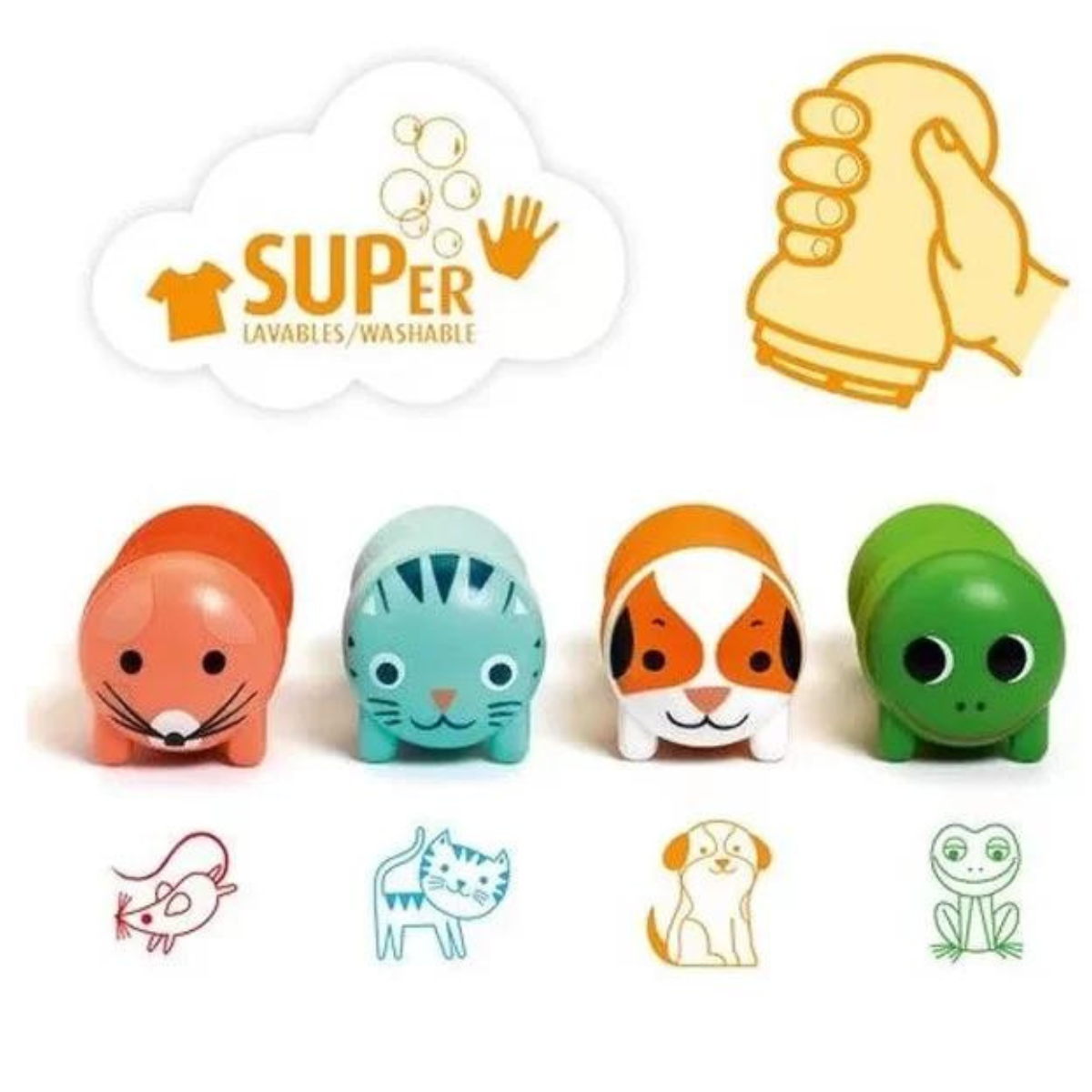 Chaque animal est associé à une couleur vive et attrayante : un chien à l’encre orange, un chat à l’encre bleue, une souris à l’encre rose et une grenouille à l’encre verte. Ces tampons permettent non seulement de jouer avec les formes et les couleurs, mais aussi de développer la motricité fine et la coordination œil-main des enfants. Grâce à leur conception auto-encreuse, il suffit d’appuyer le tampon sur la feuille pour voir apparaître l’animal choisi, évitant ainsi les taches d’encre indésirables, car l’encre est astucieusement intégrée à l’intérieur de chaque tampon.