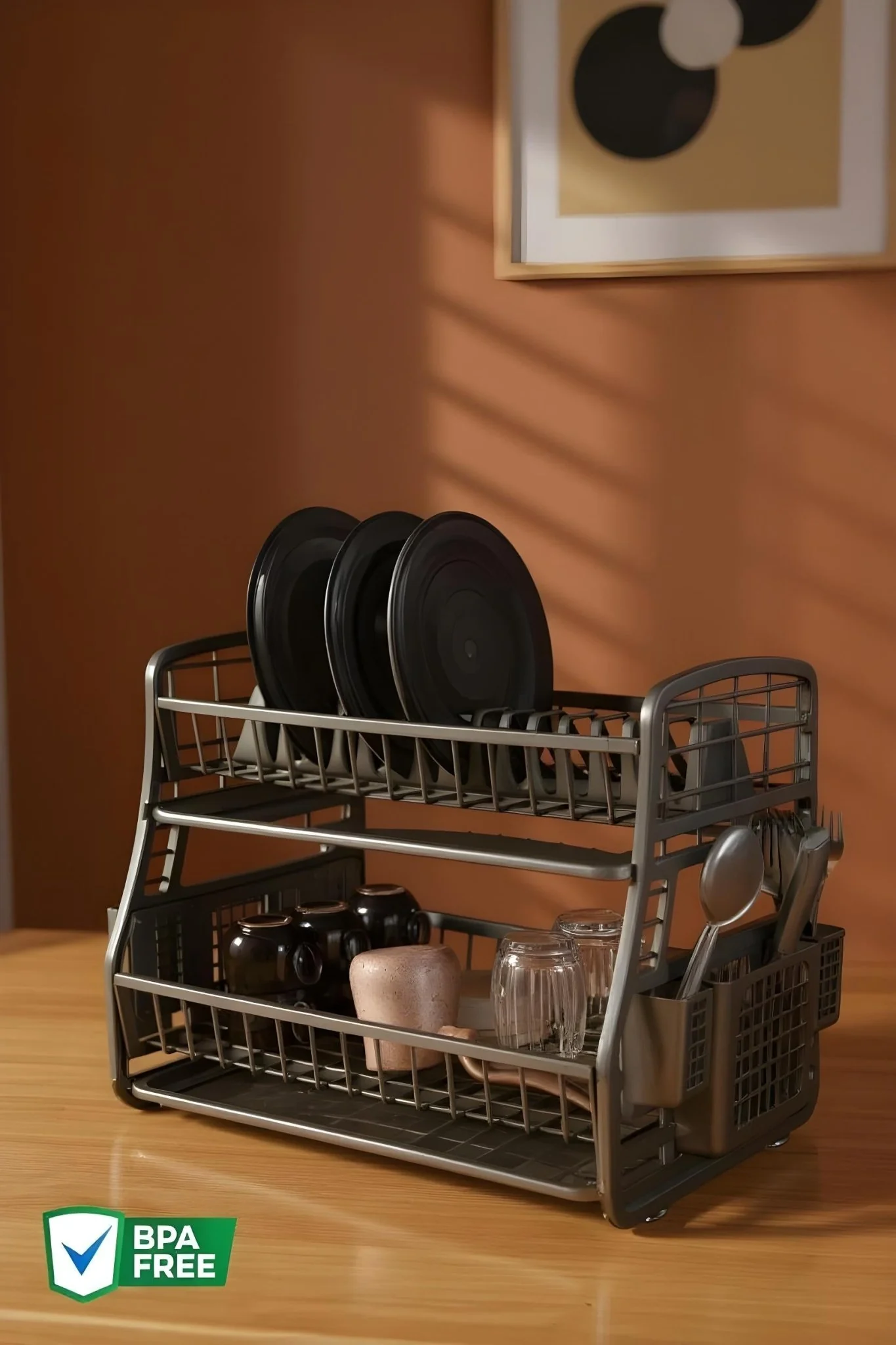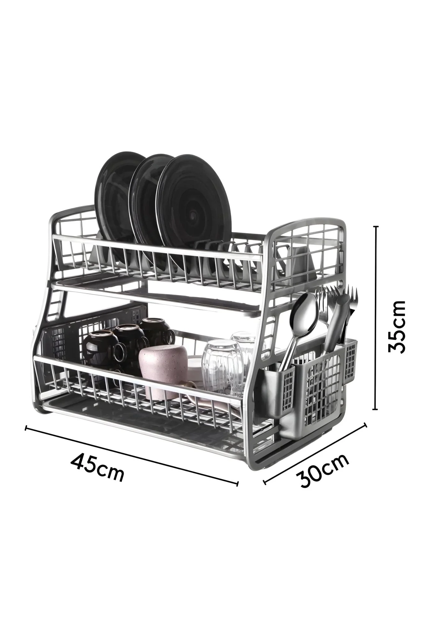 L’égouttoir vaisselle double niveau est conçu pour organiser la vaisselle sur le plan de travail. Grâce à sa structure à deux niveaux, il permet de ranger assiettes, verres et ustensiles de manière ordonnée et accessible.