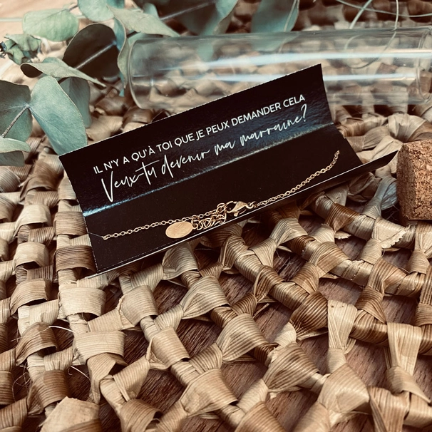 Charmant bracelet pour solliciter une marraine, avec l’inscription « Accepteras-tu d’être ma marraine ». Ce cadeau raffiné est idéal pour annoncer une naissance ou pour formuler une demande spéciale.