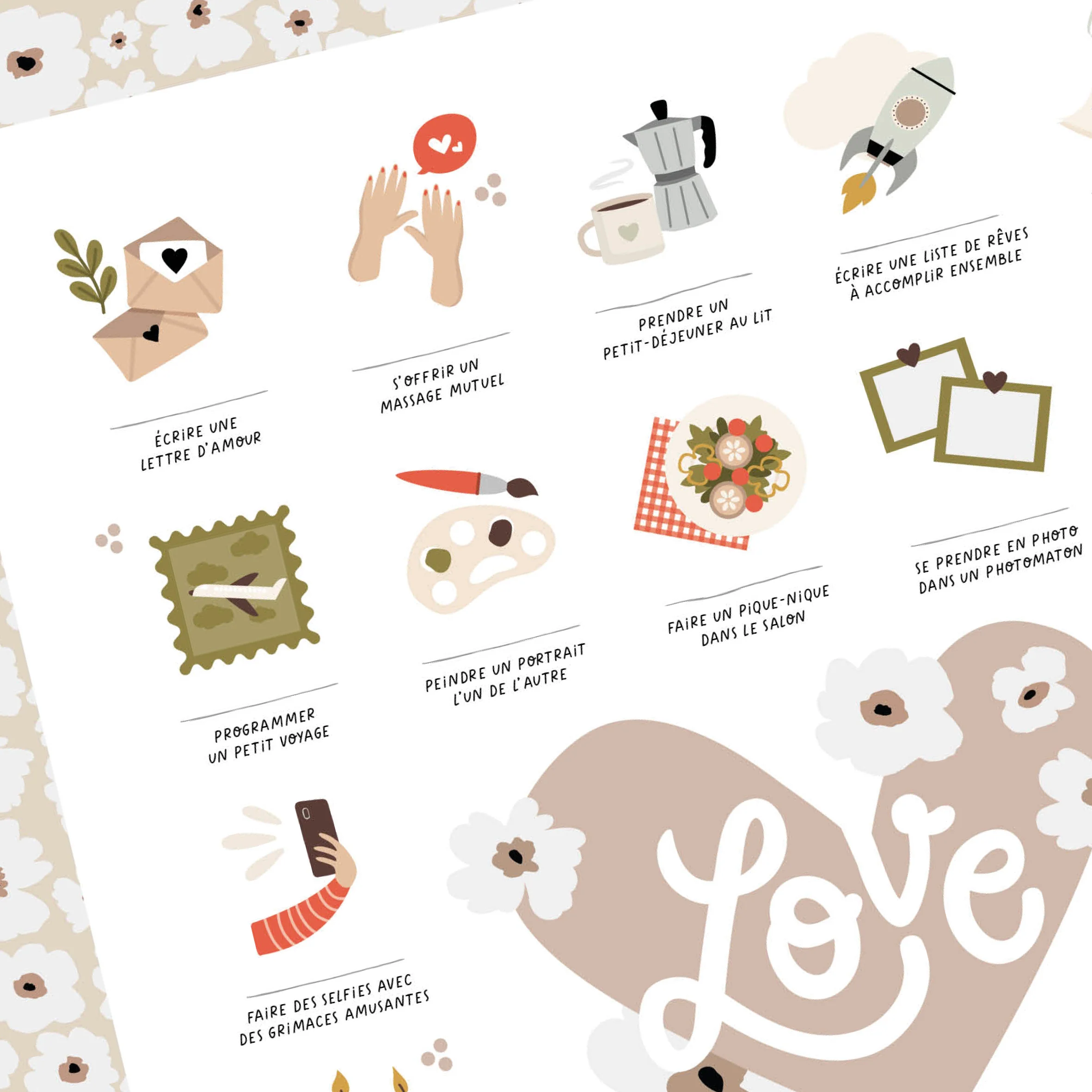 Partagez 24 moments complices et inoubliables à deux : tatouages éphémères, dîner à la bougie, lecture à voix haute, petits mots cachés… Autant d’idées tendres, originales ou un peu folles pour raviver la flamme, se redécouvrir et créer ensemble de jolis souvenirs. Chaque défi comporte une case à dater pour immortaliser ces instants précieux.