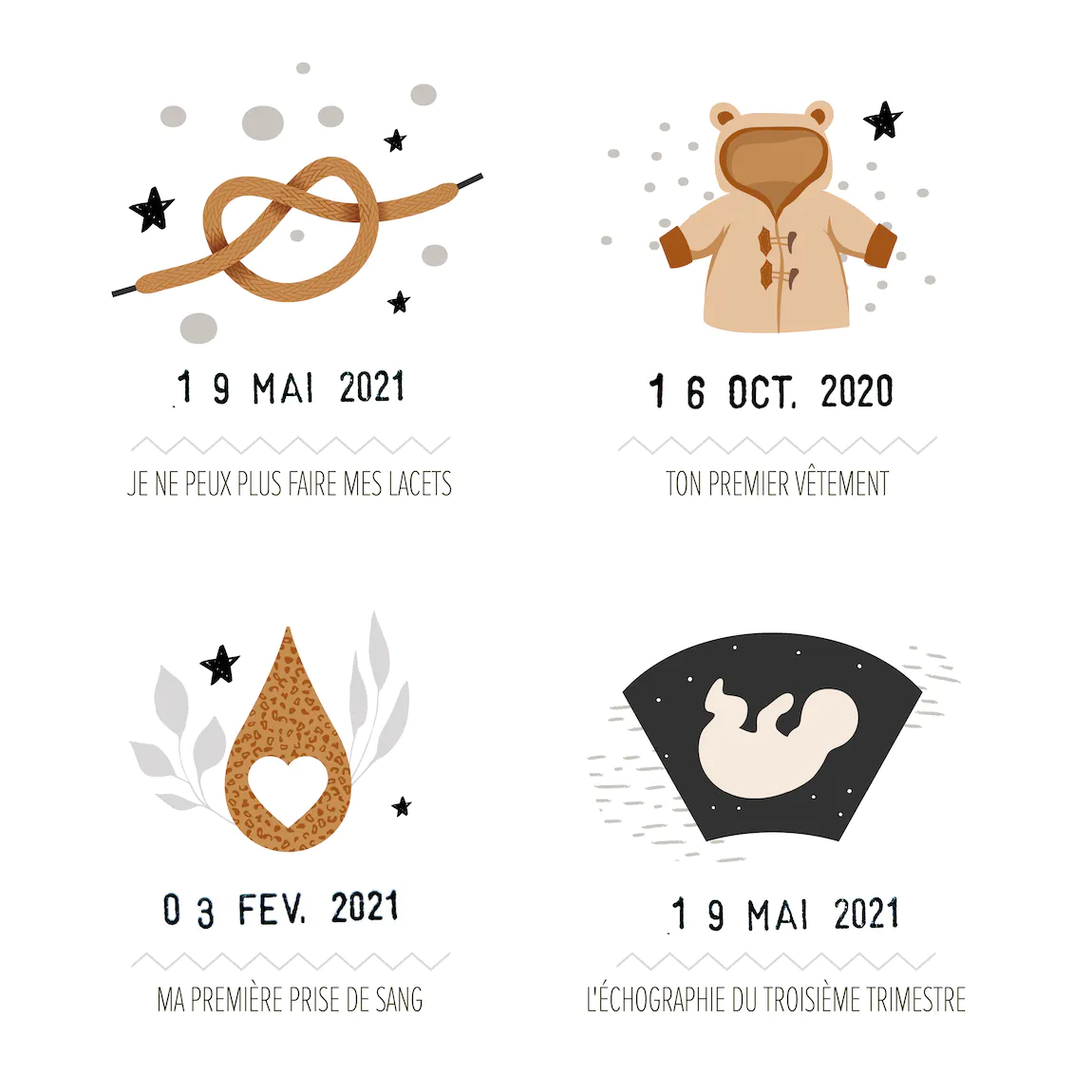 Cette affiche comprend 61 moments clés de la grossesse. Entre « l’annonce à la famille » et « le début des contractions », vous pouvez marquer chaque étape importante. Chaque moment est à dater facilement grâce au tampon dateur et à l’encrier inclus.