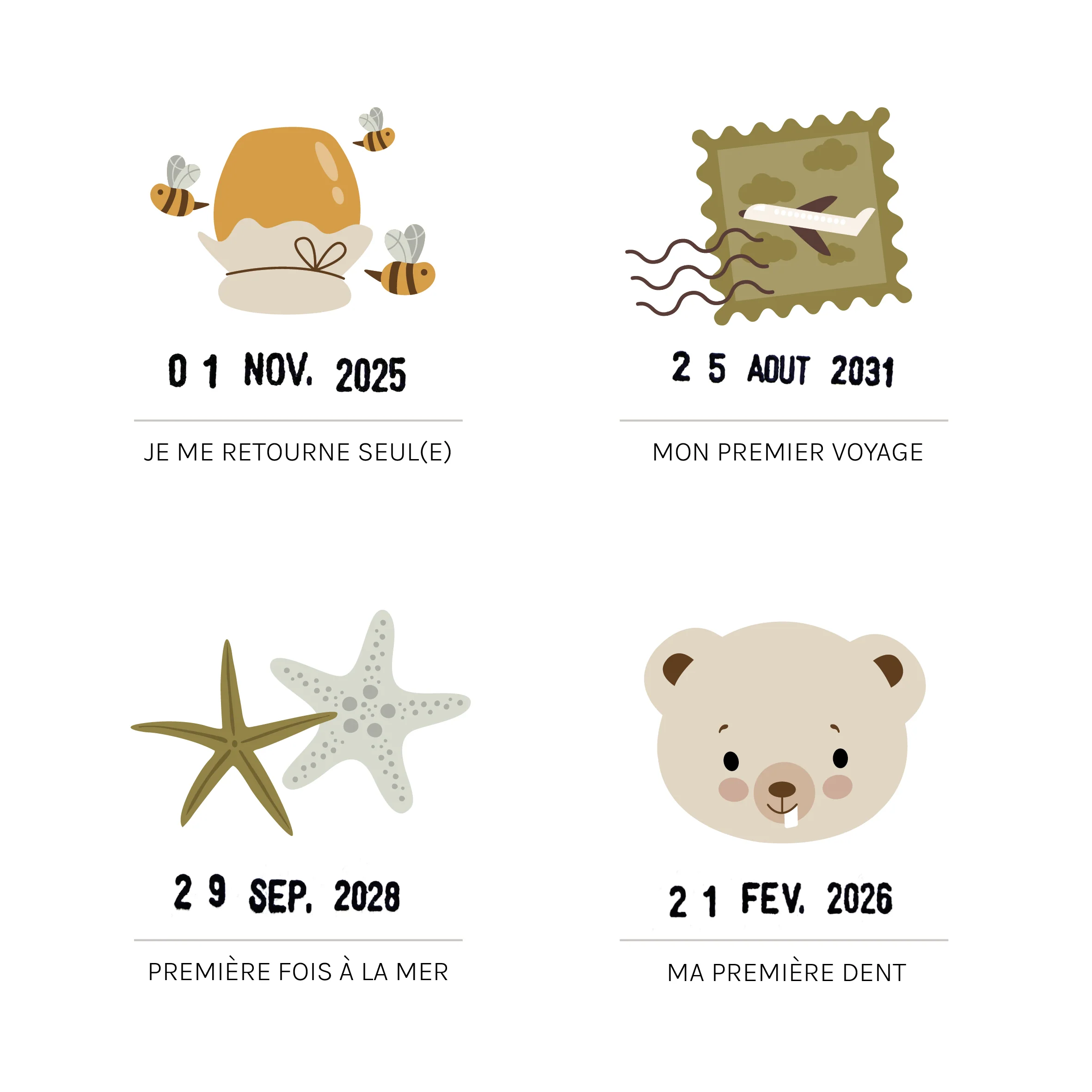 Elle comprend 61 “premières fois” soigneusement sélectionnées, offrant une belle rétrospective des premières années de vie. Grâce à son tampon dateur inclus et à son encrier noir, chaque étape devient une empreinte unique, transformant cette affiche en un véritable souvenir à conserver précieusement.