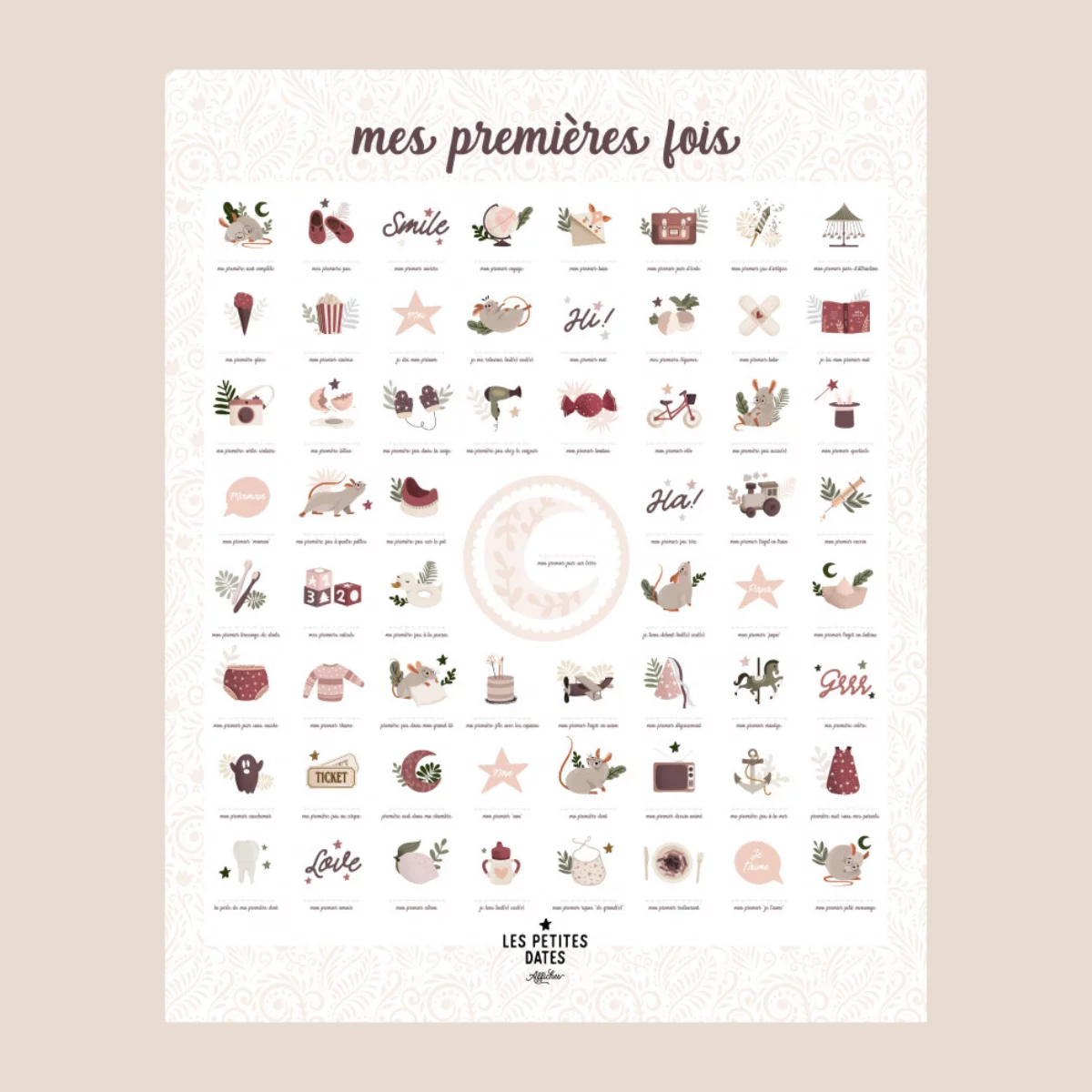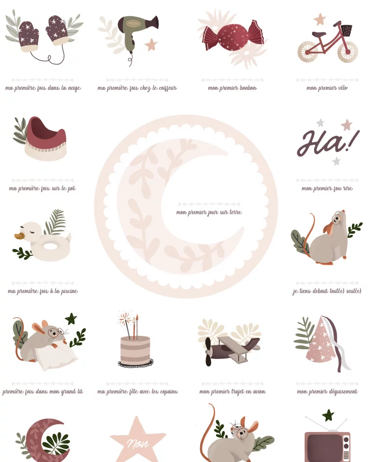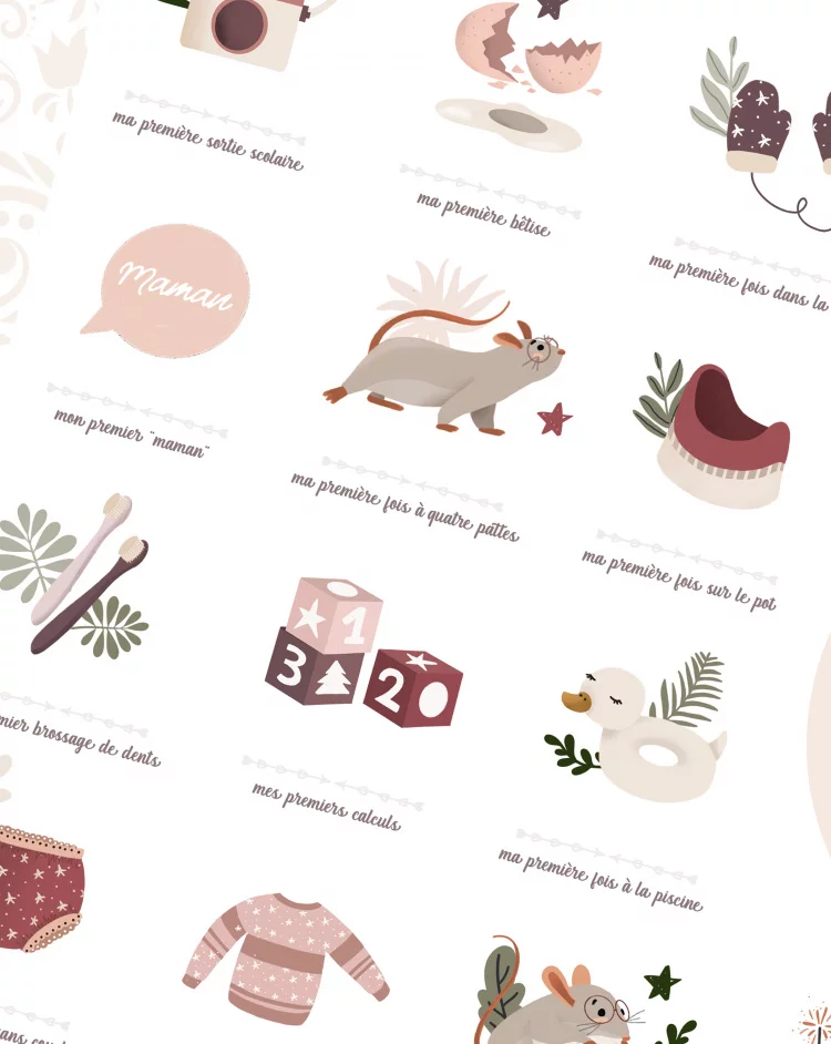 Cette affiche comprend 61 événements à marquer. Vous pourrez y inscrire la date de chaque moment spécial grâce au tampon dateur et à l’encre noire fournis. C’est un moyen simple et ludique de suivre les premières étapes de la vie de votre enfant.
