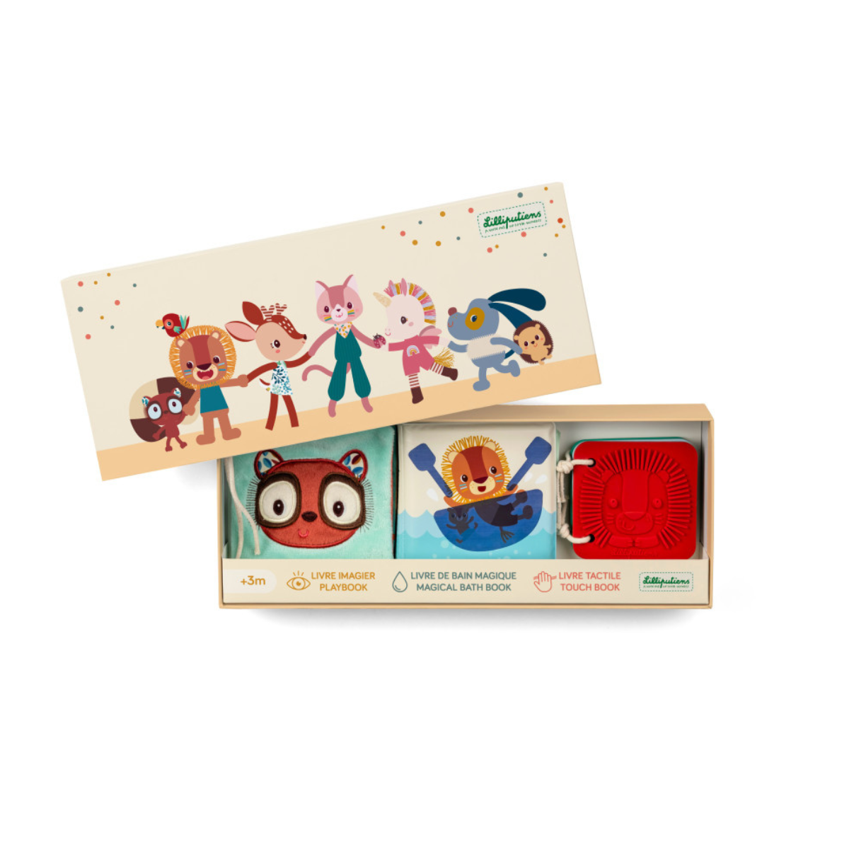 Set de 3 livres sensoriels Lilliputiens pour éveiller bébé dès la naissance : un livre en tissu aux multiples textures, un imagier en silicone à toucher, et un livre de bain magique où les illustrations apparaissent au contact de l’eau. Thème jungle avec Jack le lion et Elvis le lémurien. Idéal pour développer la curiosité, le toucher et la motricité des tout-petits, à manipuler facilement dès la naissance.