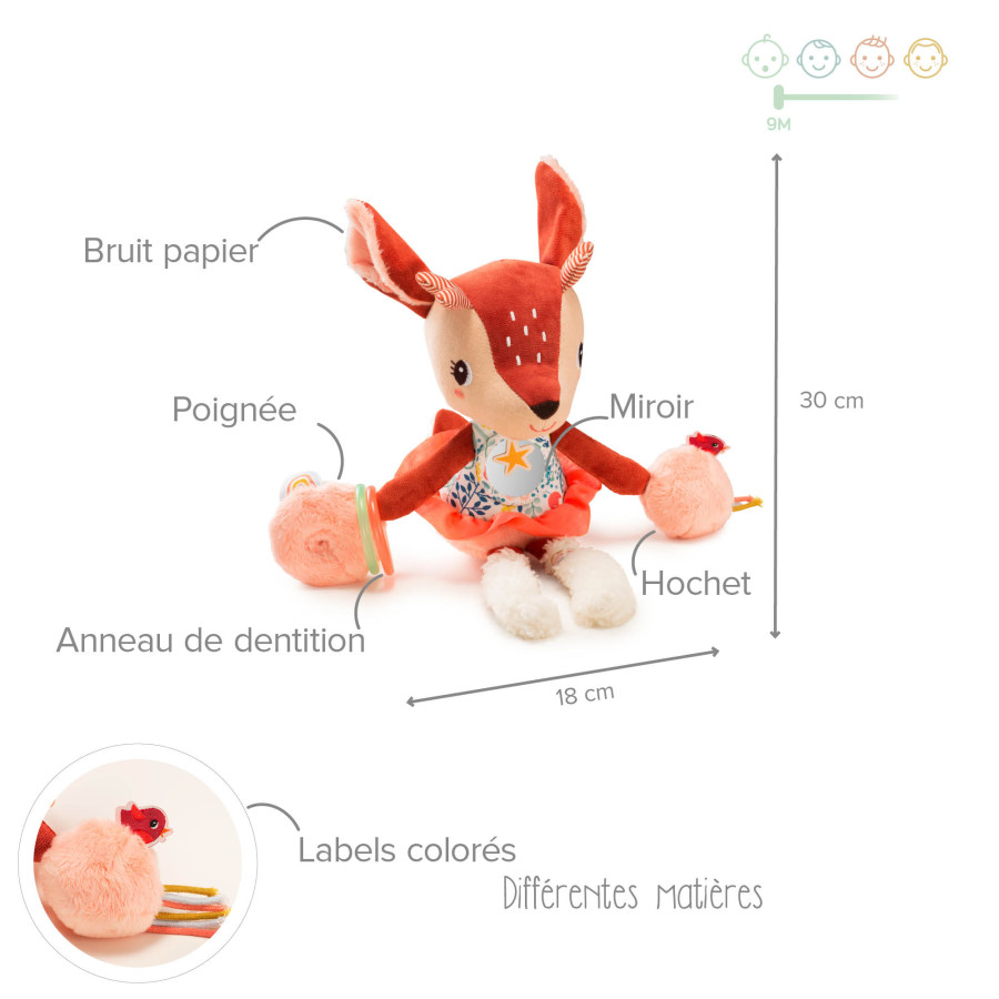 Dès 9 mois, bébé part à la découverte des multiples surprises que lui réserve cette adorable faon de 30 cm. Véritable concentré de tendresse et de jeux sensoriels, Stella propose 5 activités d’éveil pour stimuler la curiosité et les sens de votre tout-petit.
