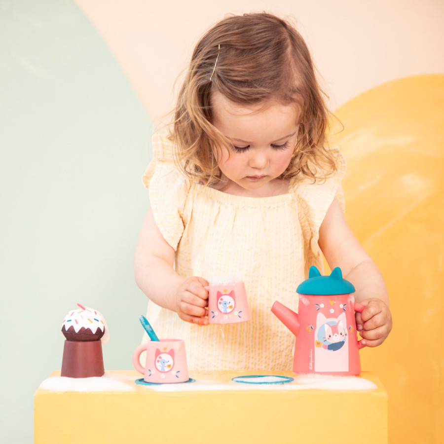 Le set comprend une théière à l’effigie de Jeanne le chat avec son couvercle en silicone et ses petites oreilles de chat, deux tasses illustrées avec de petites souris, deux sous-tasses, une petite cuillère et un muffin en deux parties pour faciliter le nettoyage. Les enfants peuvent s’amuser à remplir les tasses, verser dans la théière, ou même organiser un petit goûter avec leurs amis ou leurs peluches, stimulant ainsi leur imagination et leur motricité fine.