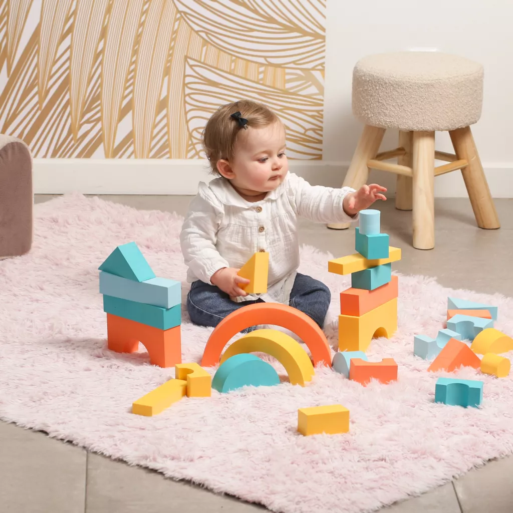 Jeu de construction en mousse pour éveiller bébé ! Avec ses 28 éléments colorés, ce jeu permet aux enfants dès 10 mois de découvrir l’art de l’empilement et de l’emboîtement. Tours, arches ou animaux fantastiques… chaque construction stimule la créativité, l’imagination et la motricité fine. Les pièces sont légères, faciles à manipuler et fabriquées en mousse souple, assurant un jeu silencieux et sécurisé. Bébé peut construire, manipuler et explorer en toute sécurité, développant sa dextérité et son autonomie. Un jeu ludique, sûr et éducatif, idéal pour transformer chaque moment de jeu en une expérience créative et sensorielle dès 10 mois.