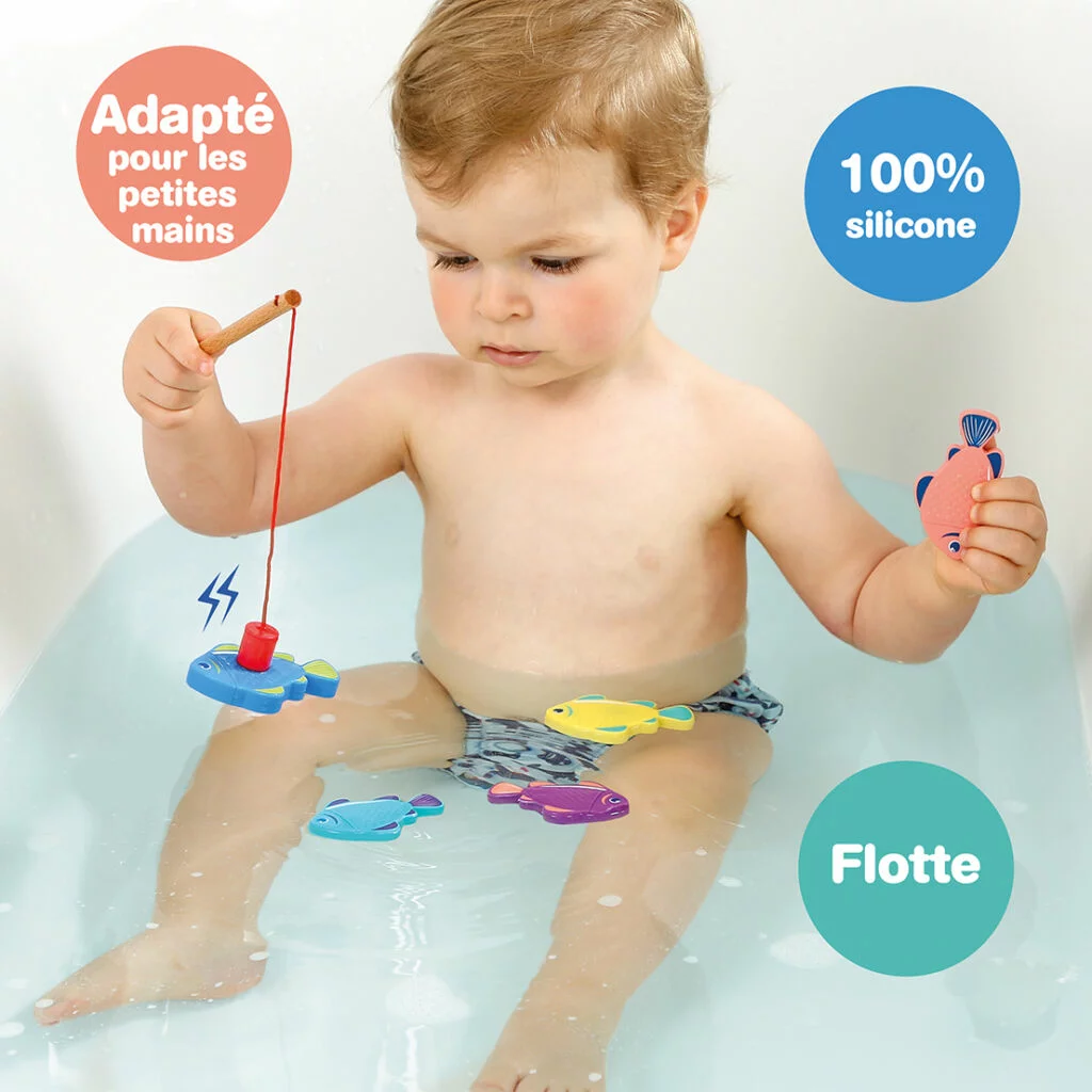 La pêche à la ligne magnétique est un jeu ludique dès 18 mois, idéal pour le bain ou les jeux d’eau. Grâce à sa canne en bois aimantée, adaptée aux petites mains, l’enfant attrape facilement les 5 poissons colorés en silicone souple et texturé. Ce jeu stimule la motricité fine, la coordination œil-main et la concentration, tout en favorisant l’éveil sensoriel et les moments de partage.