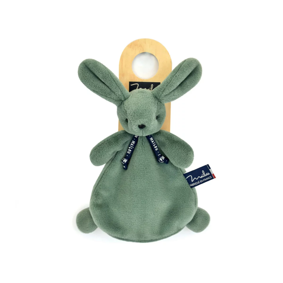 Fabriqué à la main dans l’atelier breton de Maïlou Tradition, chaque Doudou Lapin vert sauge reflète un savoir-faire artisanal transmis avec passion et exigence. Chaque détail est travaillé avec soin : ses yeux en bille, sa silhouette souple et légère, et sa taille idéale de 24 cm rendent ce doudou facile à saisir par les petites mains. Son ruban bleu marine brodé Maïlou souligne l’authenticité et la qualité de cette création artisanale, tandis que la carte en bois réutilisable, transformable en accroche-porte à message, ajoute une touche poétique et personnalisable au cadeau.