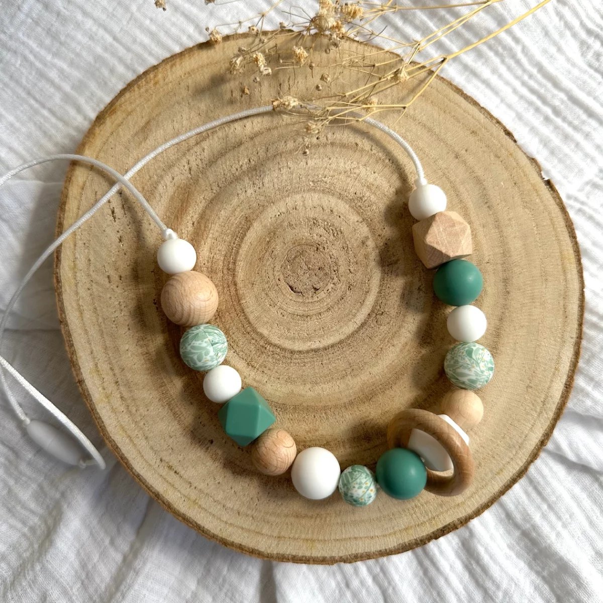 Ce collier d’allaitement ou de portage est composé de perles en bois de hêtre, en silicone alimentaire de couleur blanc, vert et quelques perles aux motifs fleuris (toujours en silicone), et d’un petit anneau en bois de hêtre.