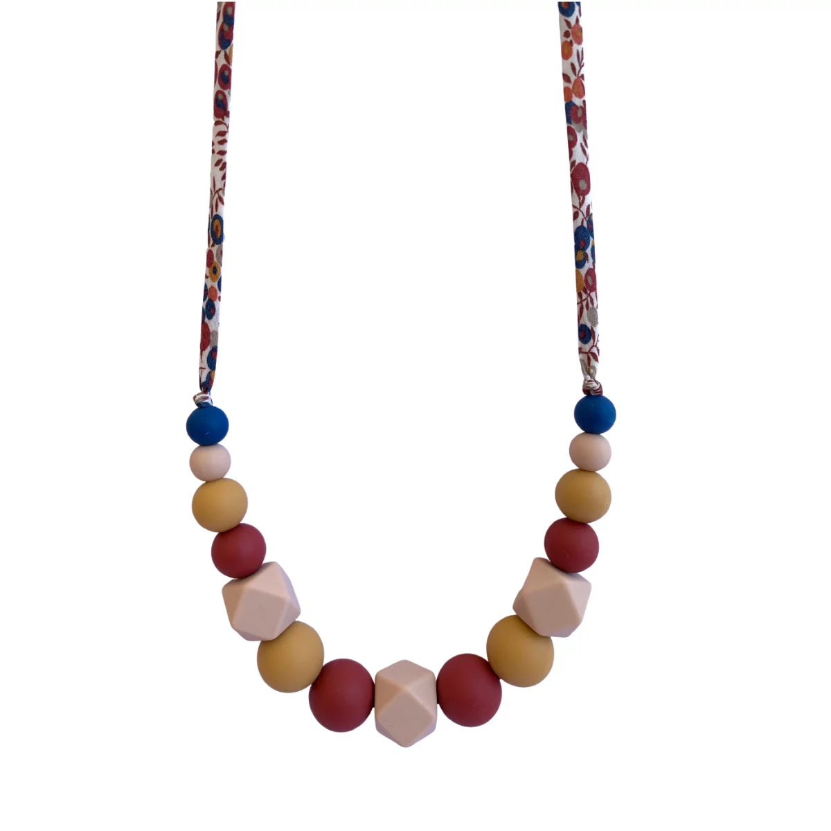 Ce collier d’allaitement ou de portage avec cordon en tissu Liberty of London, est composé de perles en silicone de couleur amande, bleu saphir, terracotta et taupe.