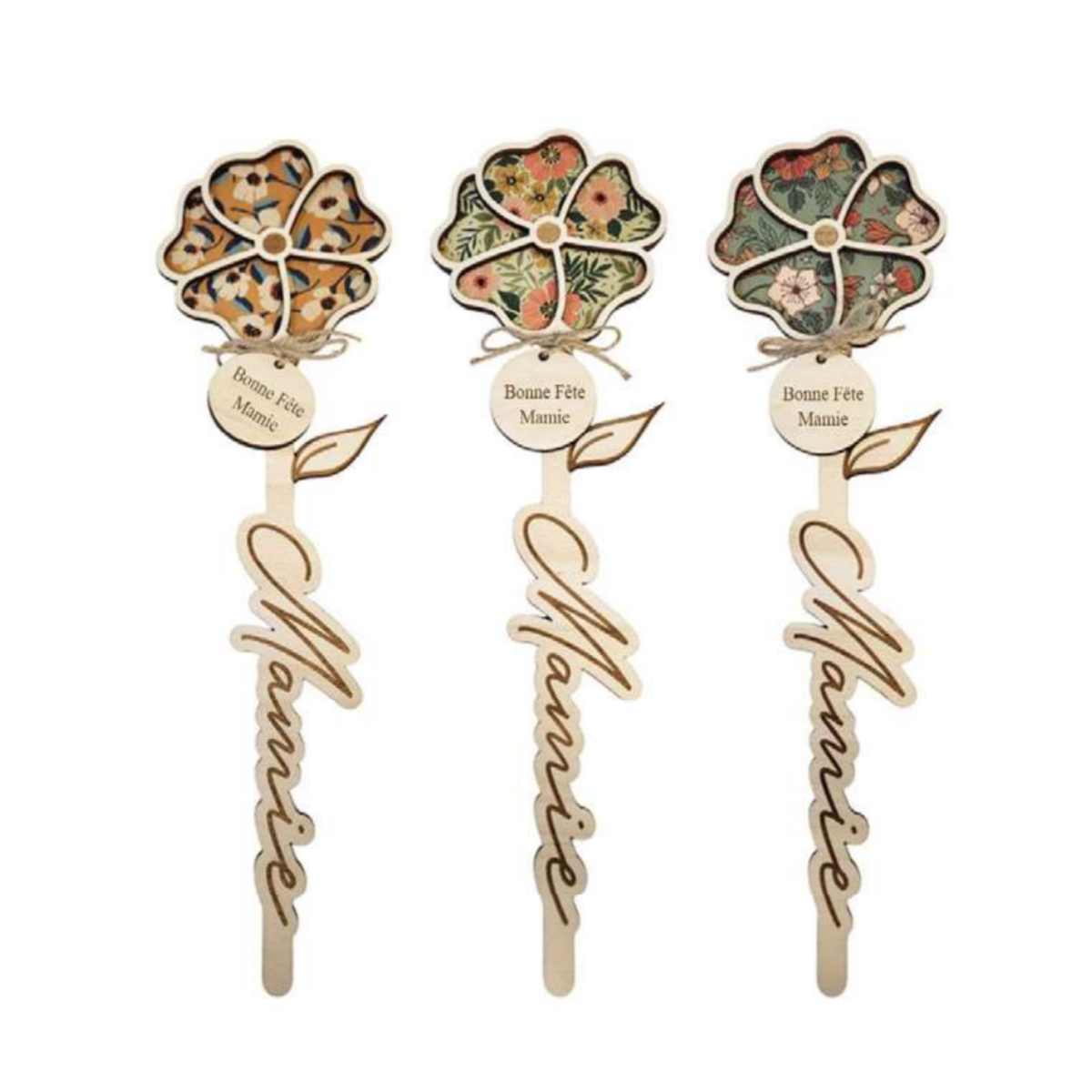 Offrez à Mamie une jolie décoration en forme de fleur, dont la tige est délicatement gravée du mot « Mamie » et les pétales ornées du motif fleuri de votre choix.
