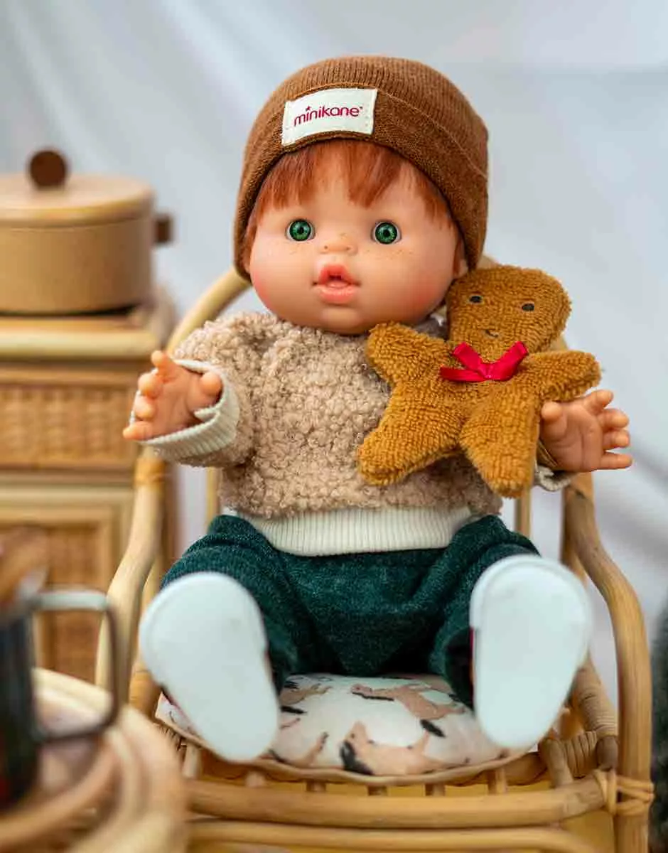 Ensemble 3 pièces “Bonhomme Pain d’épices” pour poupées et poupons Minikane Gordis 34 & 37cm. Il comprend un top manches longues en bouclette, un pantalon en tricot, un bonnet en tricot et un doudou en éponge. Chaussettes et chaussures non incluses.