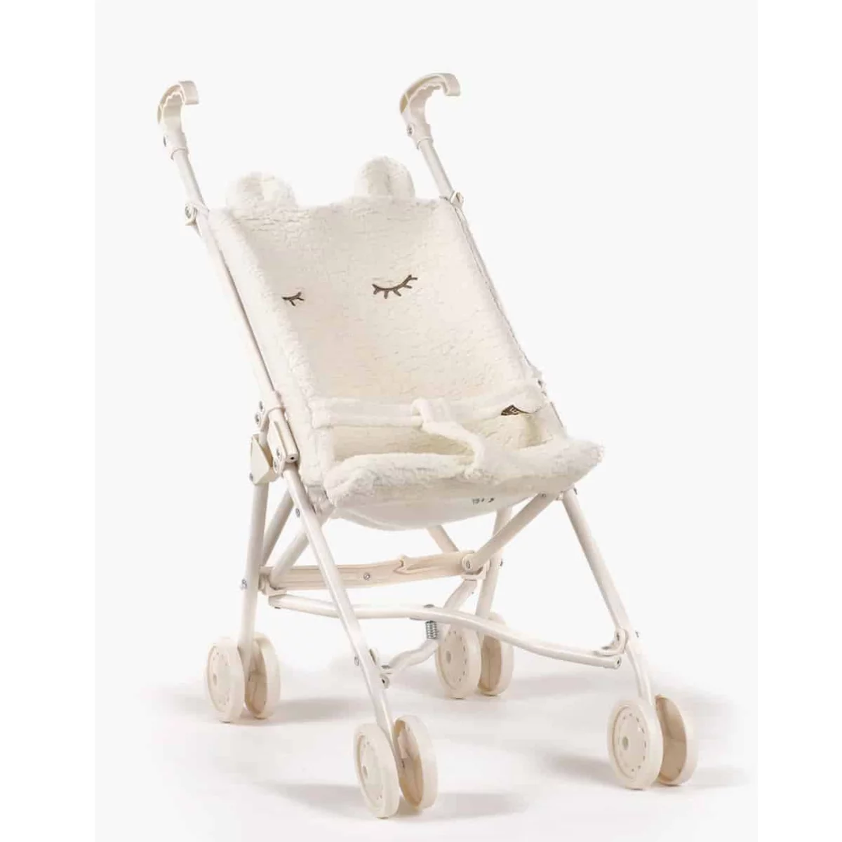 Poussette pour enfant en matière sherpa de couleur écru. Comment ne pas craquer sur cette beauté ? à compléter avec une poupée et ses accessoires.