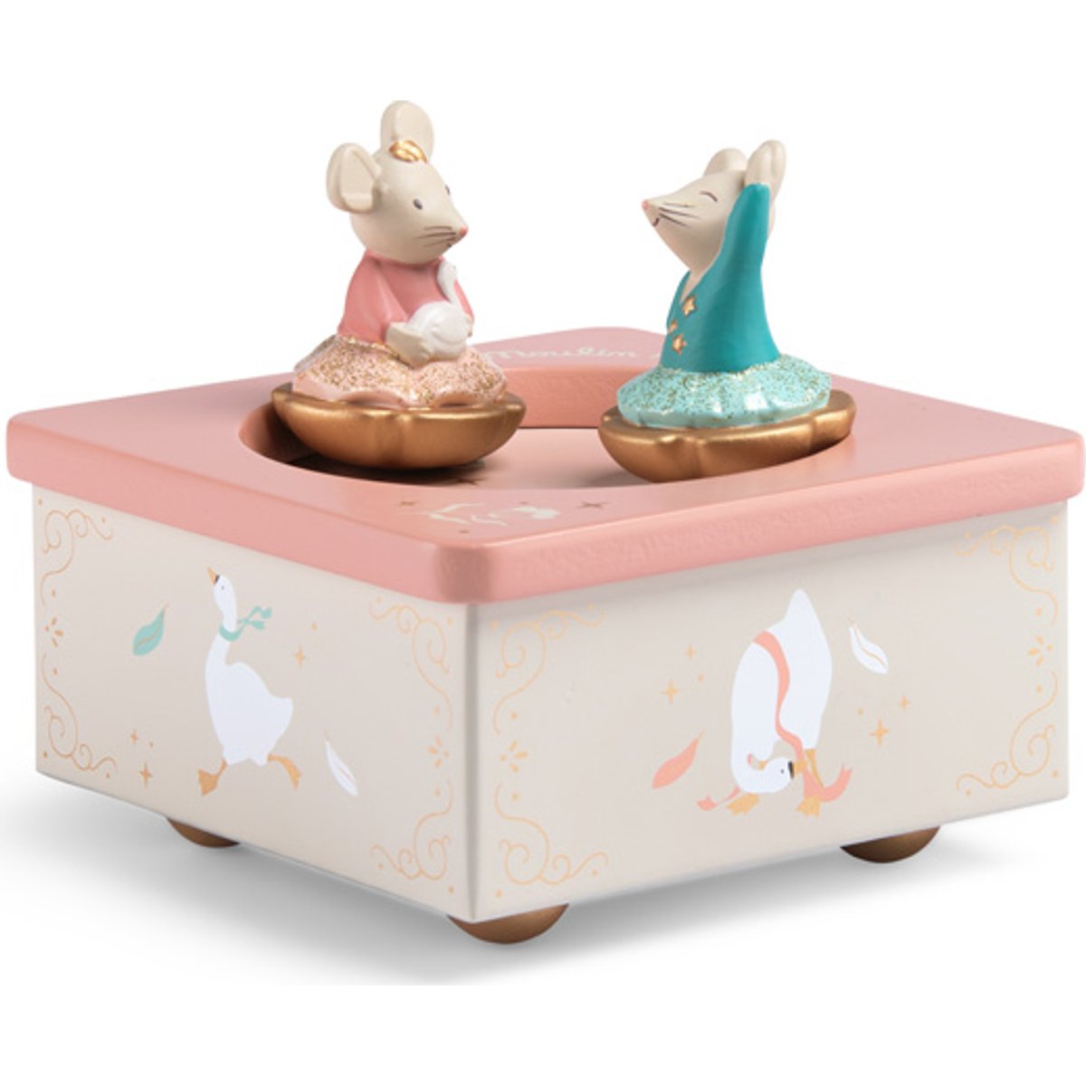 Boîte à musique poétique avec deux petites souris danseuses. Tournez le mécanisme pour les voir virevolter au son d’une douce mélodie. Un joli objet déco pour émerveiller les enfants dès 3 ans.
