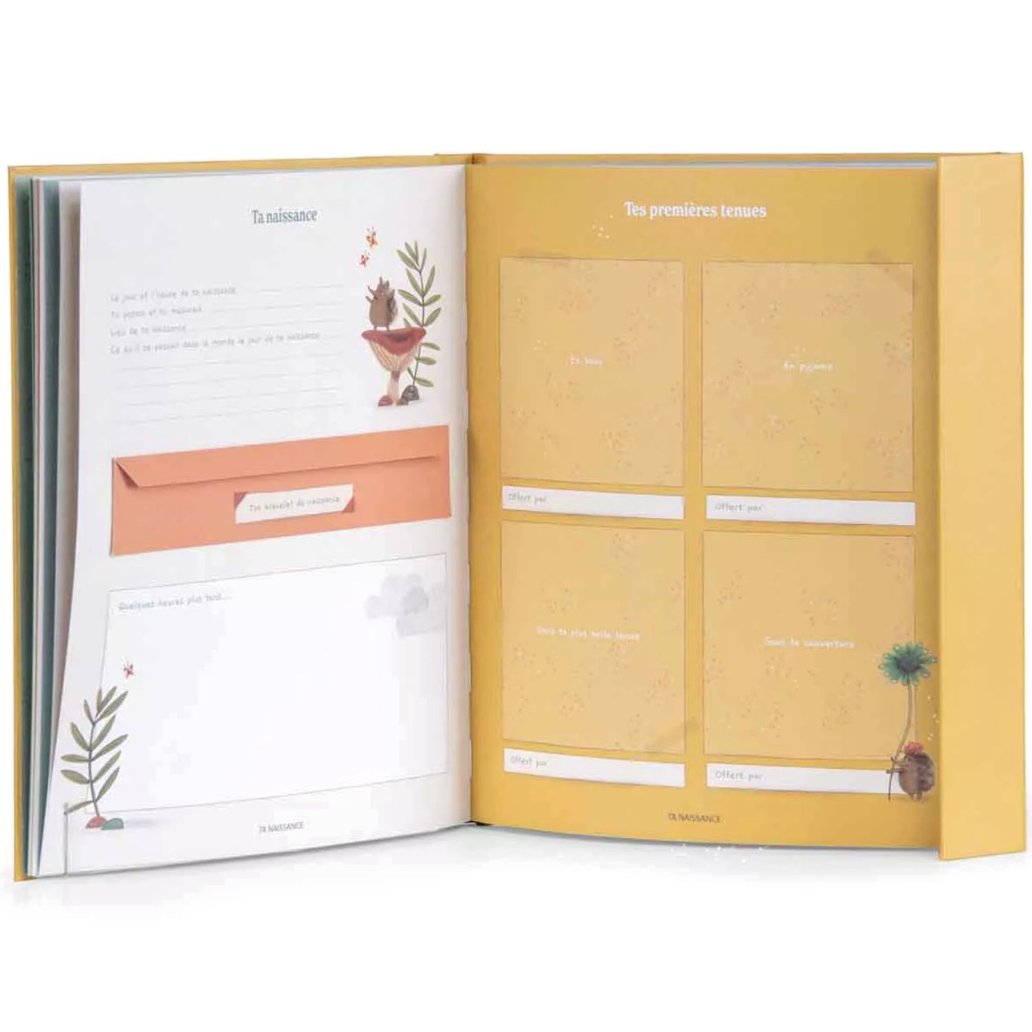 Un album tendre et poétique pour conserver les premiers souvenirs de bébé, de la naissance jusqu’à ses 6 ans. Ce livre de 80 pages illustrées permet d’y noter anecdotes, coller des photos et retracer les étapes importantes. Il comprend 6 enveloppes à souvenirs (première mèche, bracelet de maternité…), une page arbre généalogique, une fermeture aimantée ainsi qu’une toise offerte pour suivre la croissance de l’enfant. Dimension : 19,5 x 24 cmÂge : dès la naissanceMatière : papier imprimé Un cadeau précieux et intemporel, idéal pour les jeunes parents.