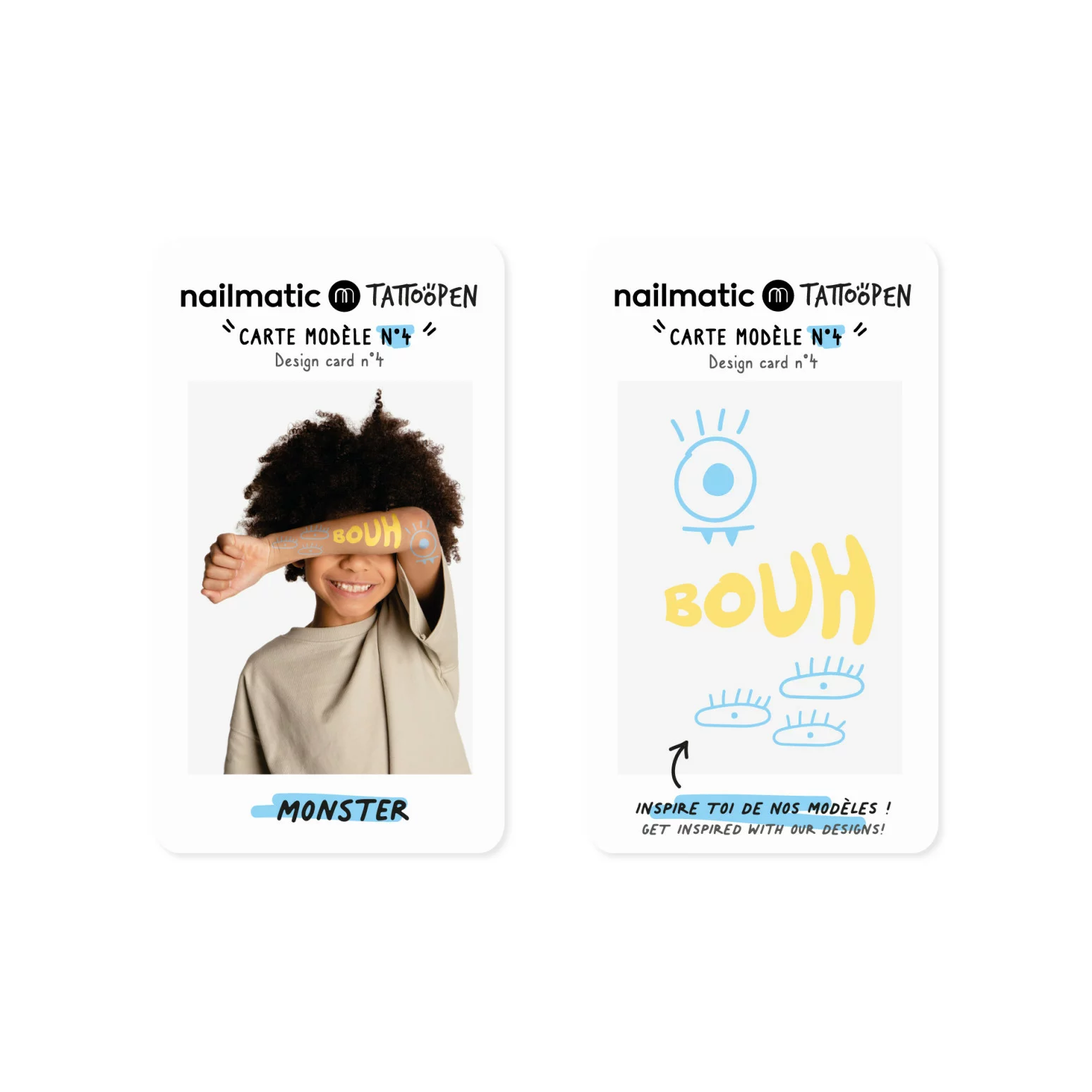 Ce kit TATTOOPEN contient : – 1 feutre de tatouage jaune – 1 feutre de tatouage bleu – 4 cartes modèles recto/verso avec des idées à tester – 1 carte mode d’emploi recto/verso Notre coffret feutres de tatouages temporaires monster ? Un super guide pour découvrir le dessin sur peau, dessiner c’est tatouer !