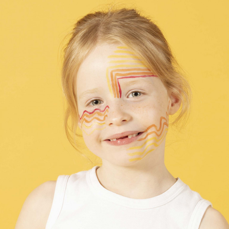 Feutre de tatouage temporaire pour visage et corps. Formule respectueuse : 60% d’eau. Respecte la peau sensible des enfants et des parents.
