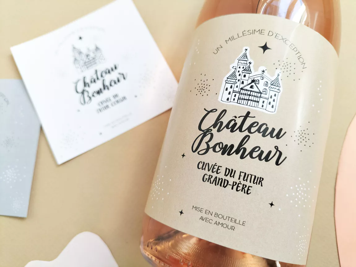 Etiquette autocollante pour bouteille de vin ou champagne pour annonce en fanfare une merveilleuse nouvelle !
