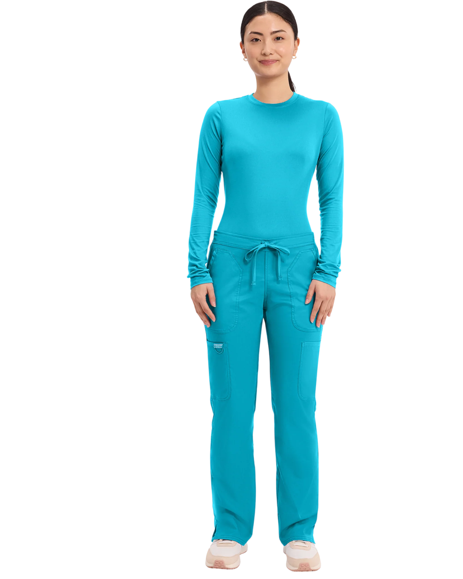 Collection Cherokee revolution: pantalon classique moderne à taille mi-haute et jambes légèrement évasées, doté d’un cordon de serrage fonctionnel et d’une ceinture élastique à l’arrière. Il comporte également des poches plaquées à l’avant, deux poches cargo, une étiquette logo avec boucle élastique, une poche arrière et des fentes latérales.