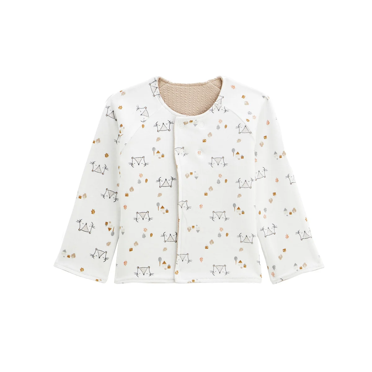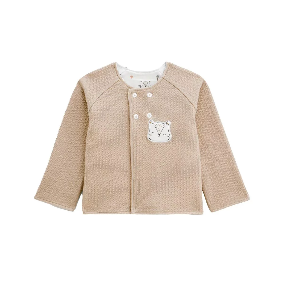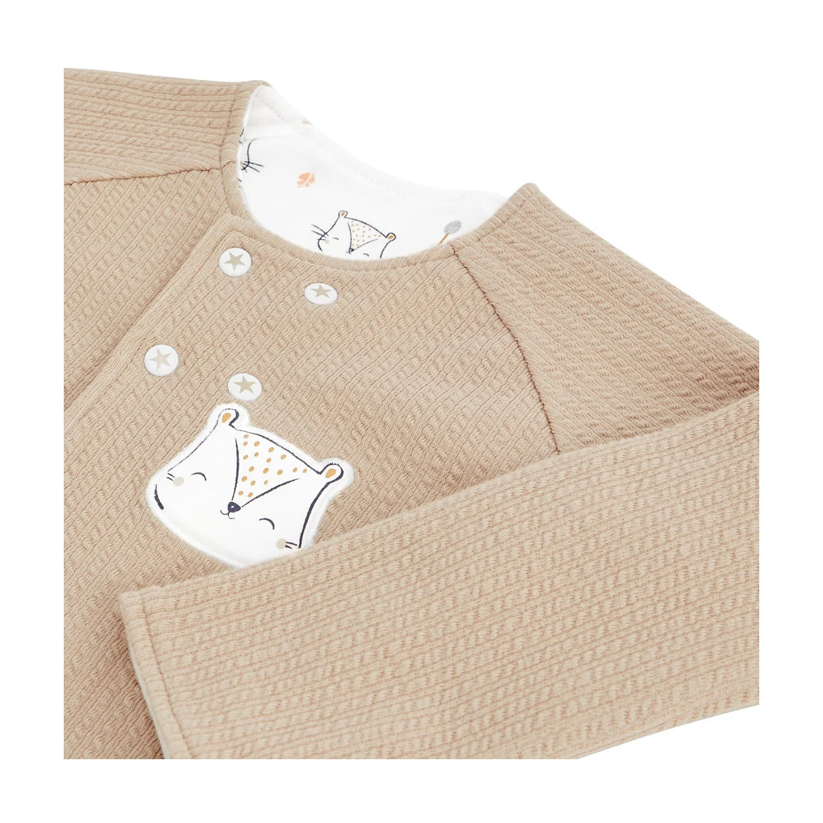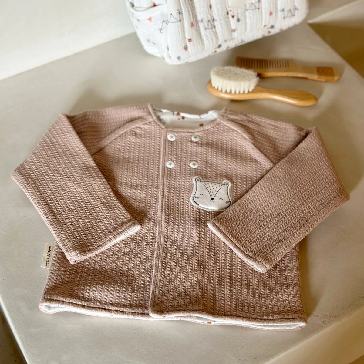 Vous allez devenir dingue de ce joli gilet pour bébé. En plus d’être conçu pour réchauffer votre bout de chou avec beaucoup de réconfort, il s’adaptera également à toutes ses tenues ou à vos envies grâce à ses faces réversibles ! Optez pour le côté marron glacé en coton avec relief et son petit écureuil brodé, ou pour la face écrue imprimée en all over : de quoi plaire à tous !