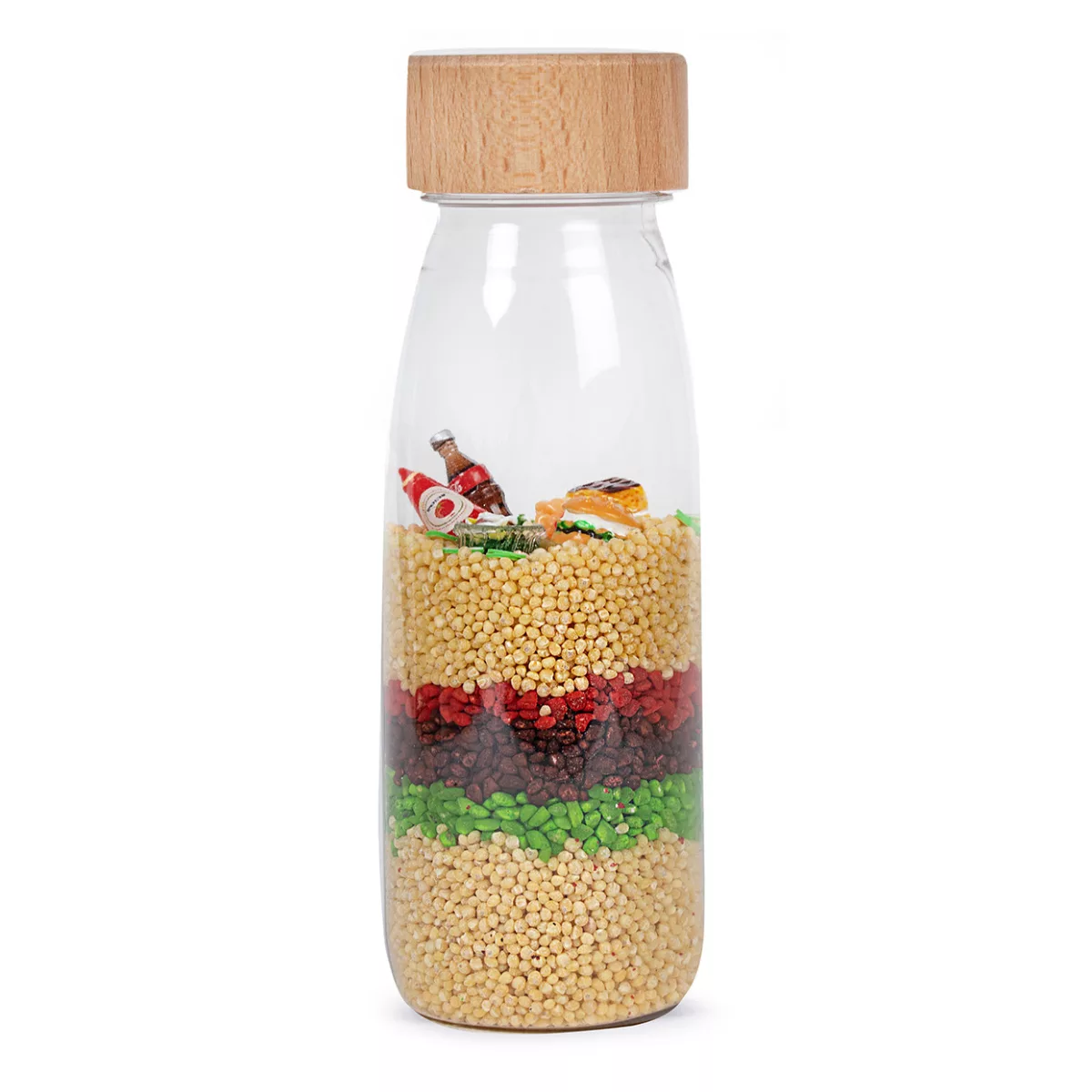 Conçue par la marque Petit Boum, la Bouteille Sensorielle Learn est un jeu captivant qui éveillera tous les sens de bébé. Ce jouet ludique et éducatif invite votre enfant à découvrir un univers coloré inspiré du monde de la restauration rapide, où un mini-burger, un soda, de la salade, des frites et de la sauce tomate dansent à chaque mouvement. En secouant la bouteille, votre enfant verra ces éléments bouger et tourbillonner, suscitant sa curiosité et éveillant son sens de l’observation.