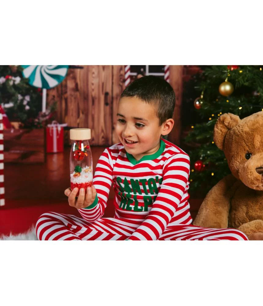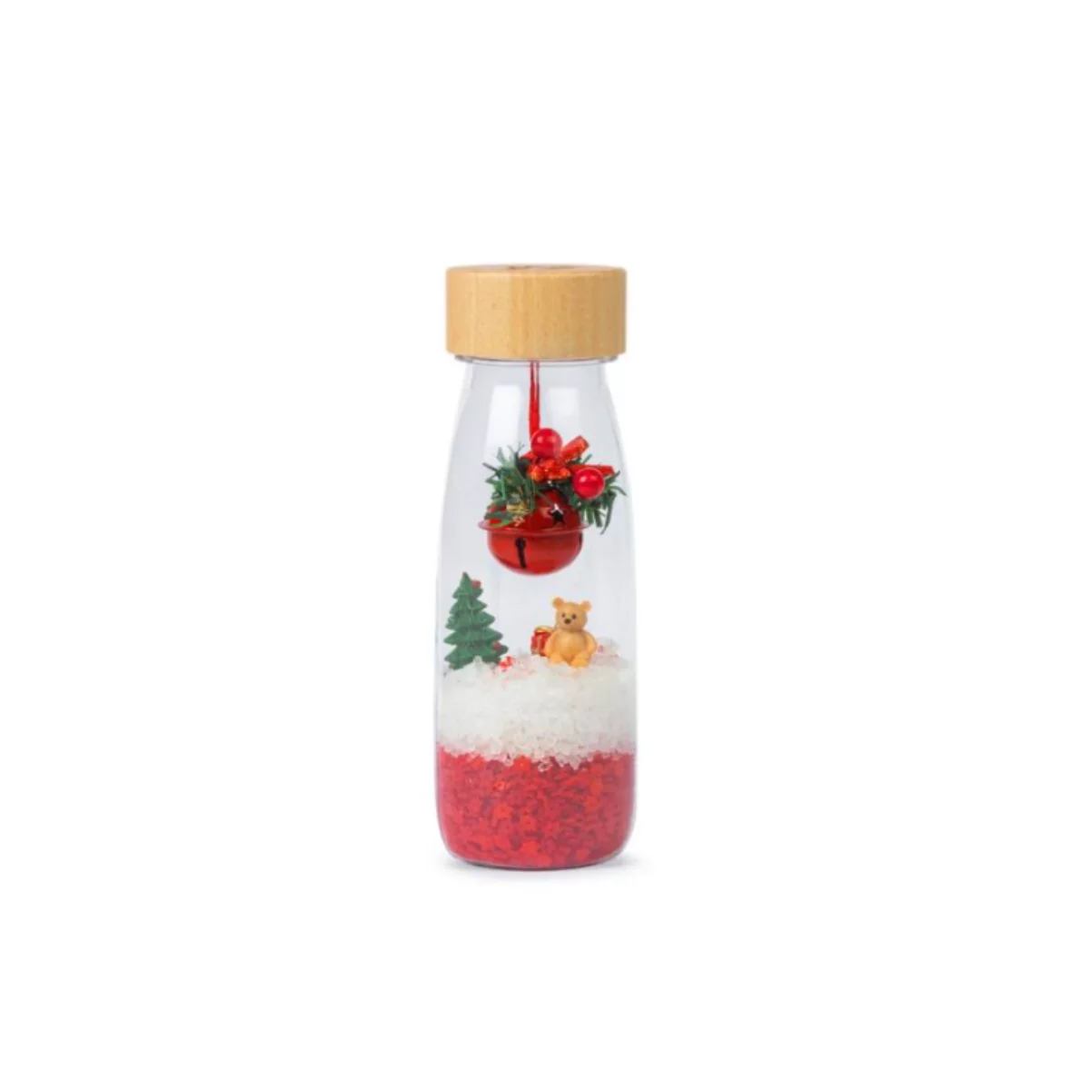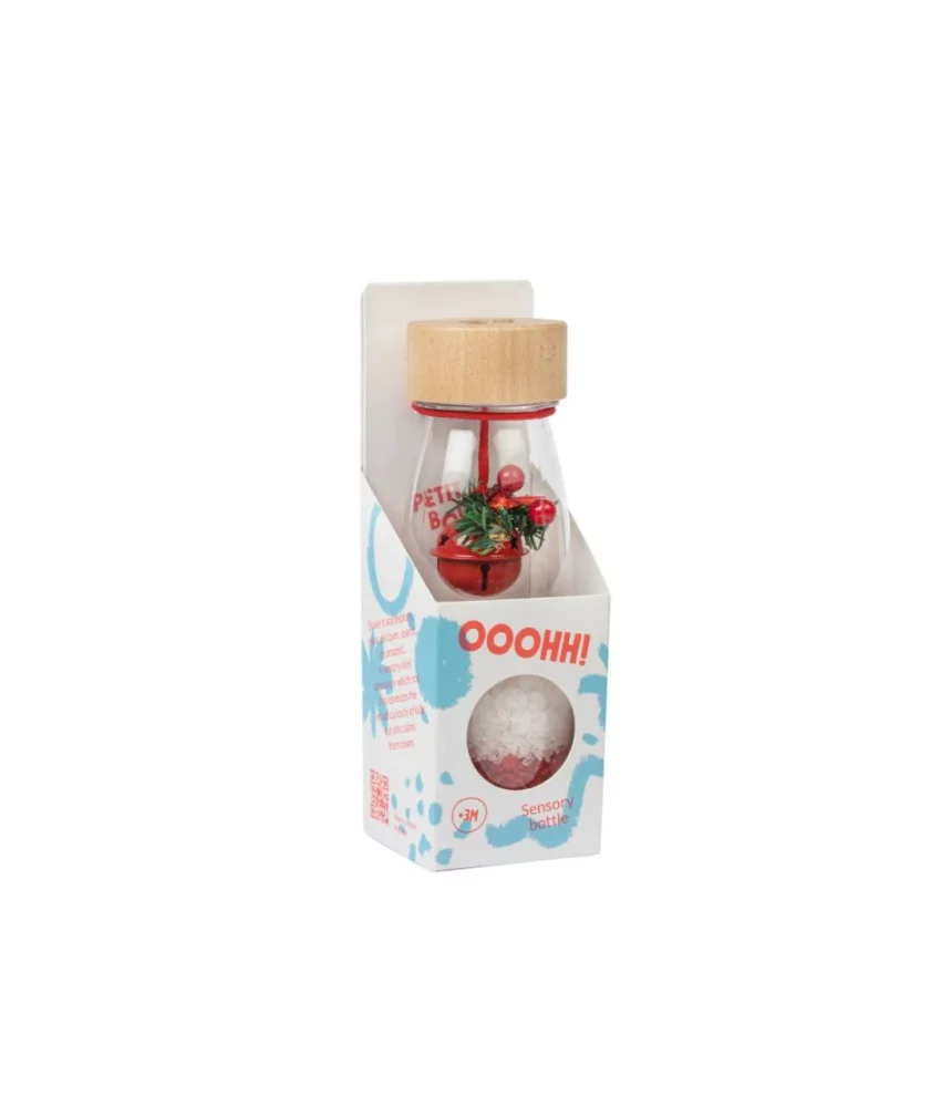 Fabriquée à la main en Espagne, à partir de plastique recyclable, d’un bouchon en bois d’érable et d’éléments naturels, la bouteille sensorielle Petit Boum est incassable.