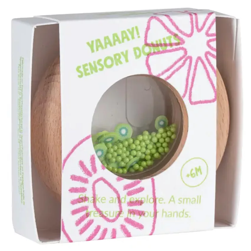 Le Donut Sensoriel Kiwis éveille les sens des tout-petits dès 6 mois avec ses billes colorées et ses motifs de Kiwis. Facile à saisir et secouer, ce hochet en bois de hêtre naturel produit un son doux et est parfaitement sûr pour bébé. Compact et amusant, il est idéal pour accompagner bébé partout !