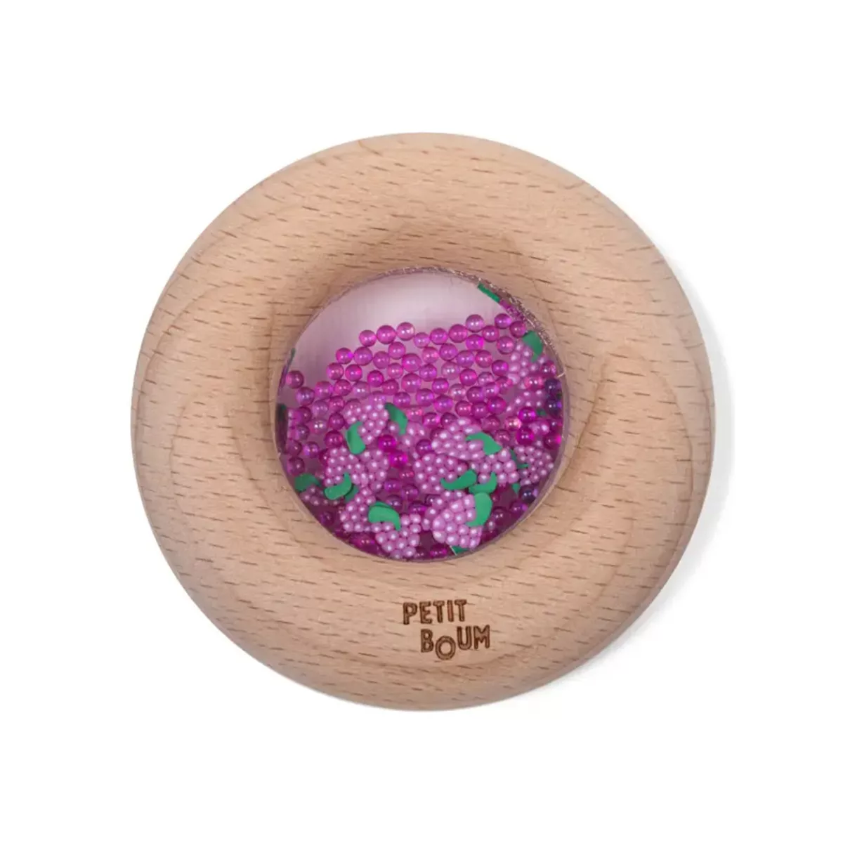 À l’intérieur, un spectacle coloré attend les petits curieux : des billes vives et des motifs en forme de raisins s’animent joyeusement lorsqu’on agite le jouet. Ce mouvement, accompagné d’un léger son apaisant, contribue au développement des sens, notamment de la vue et de l’ouïe.