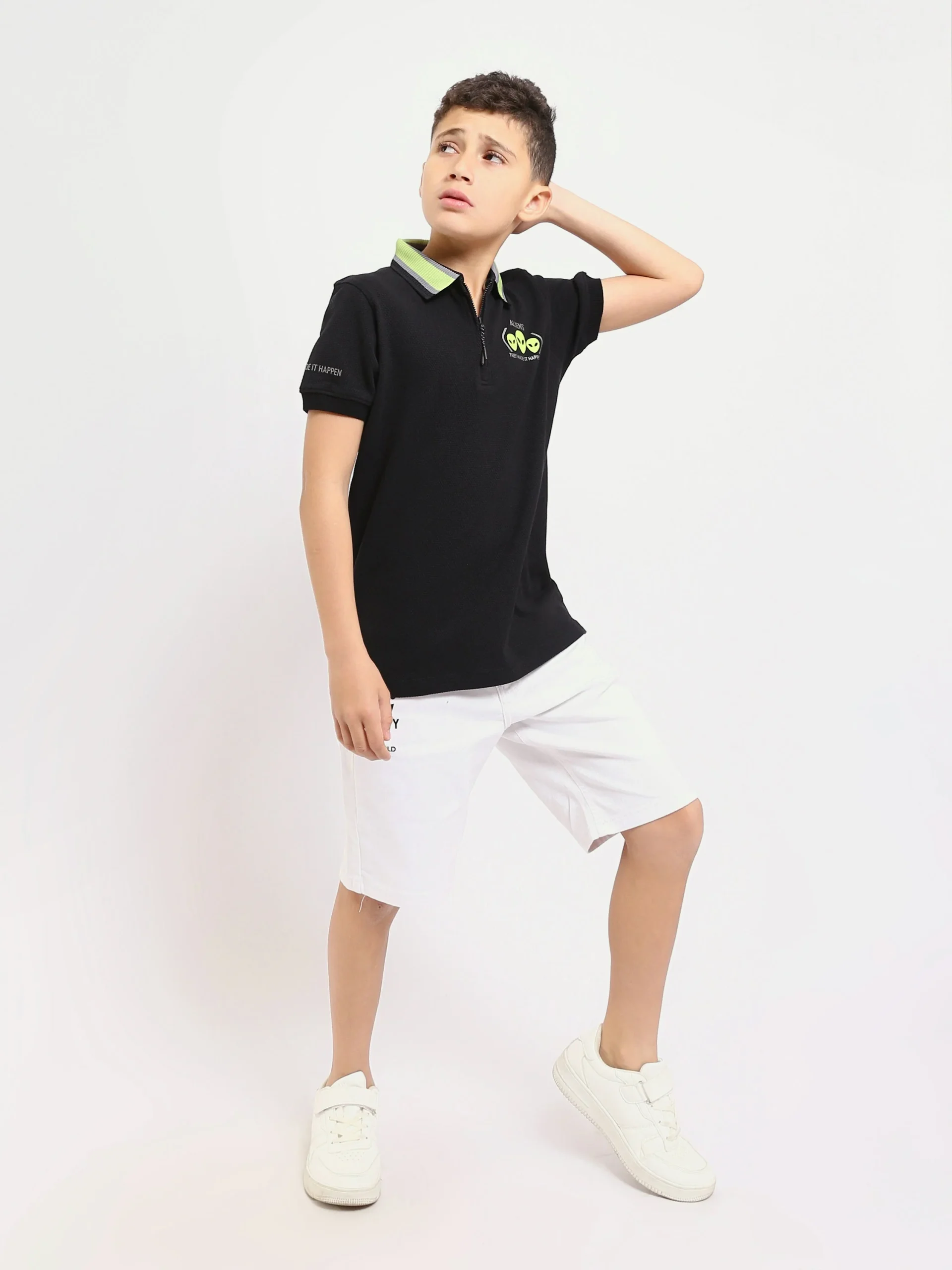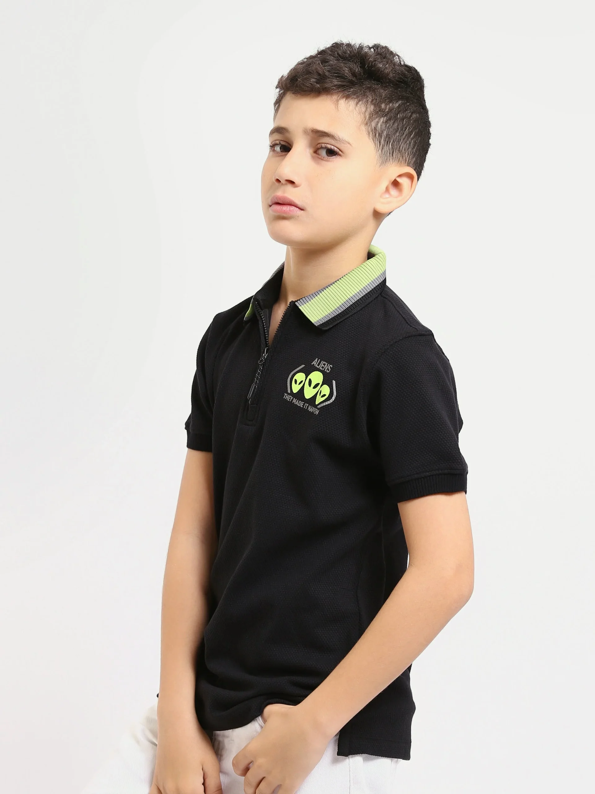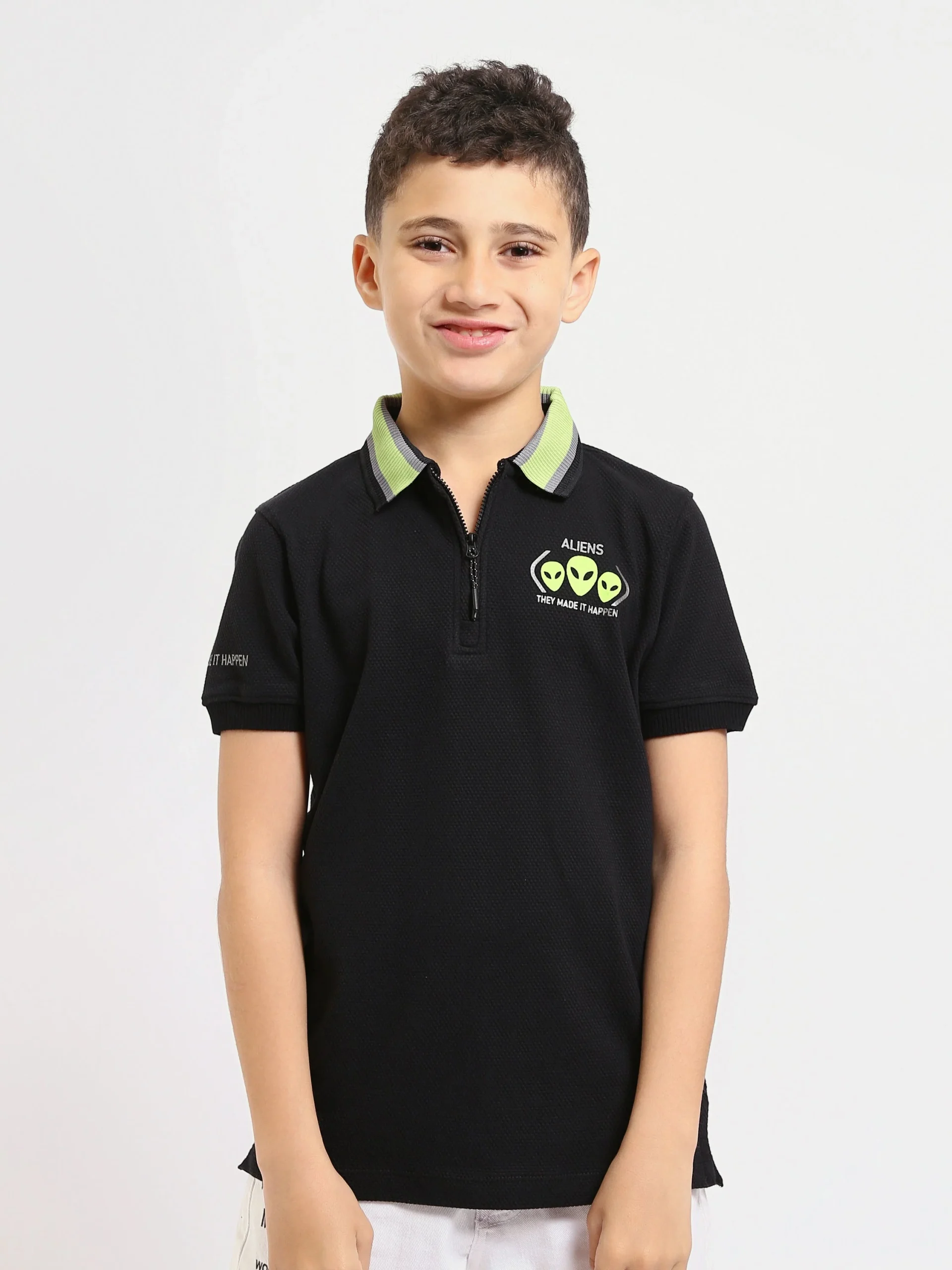 Polo enfant garçon au design moderne et attractif, proposé dans un coloris noir élégant avec un col polo doté d’une fermeture zippée pratique. Il est orné d’un imprimé graphique contemporain sur le thème des créatures spatiales au niveau de la poitrine, offrant un look tendance parfaitement adapté au quotidien.