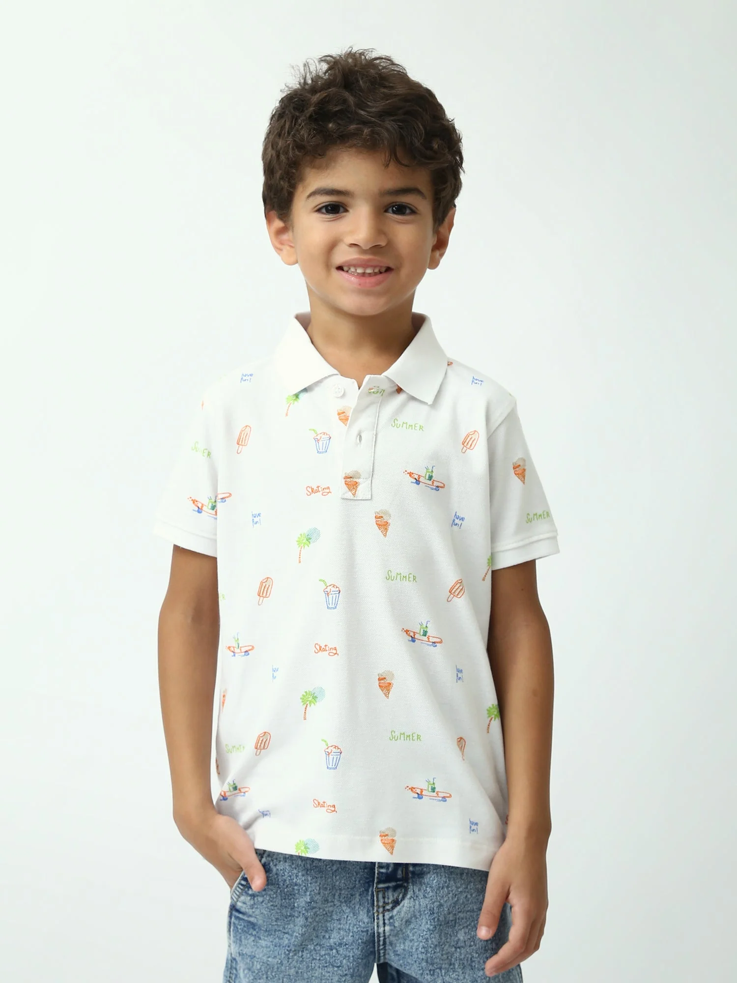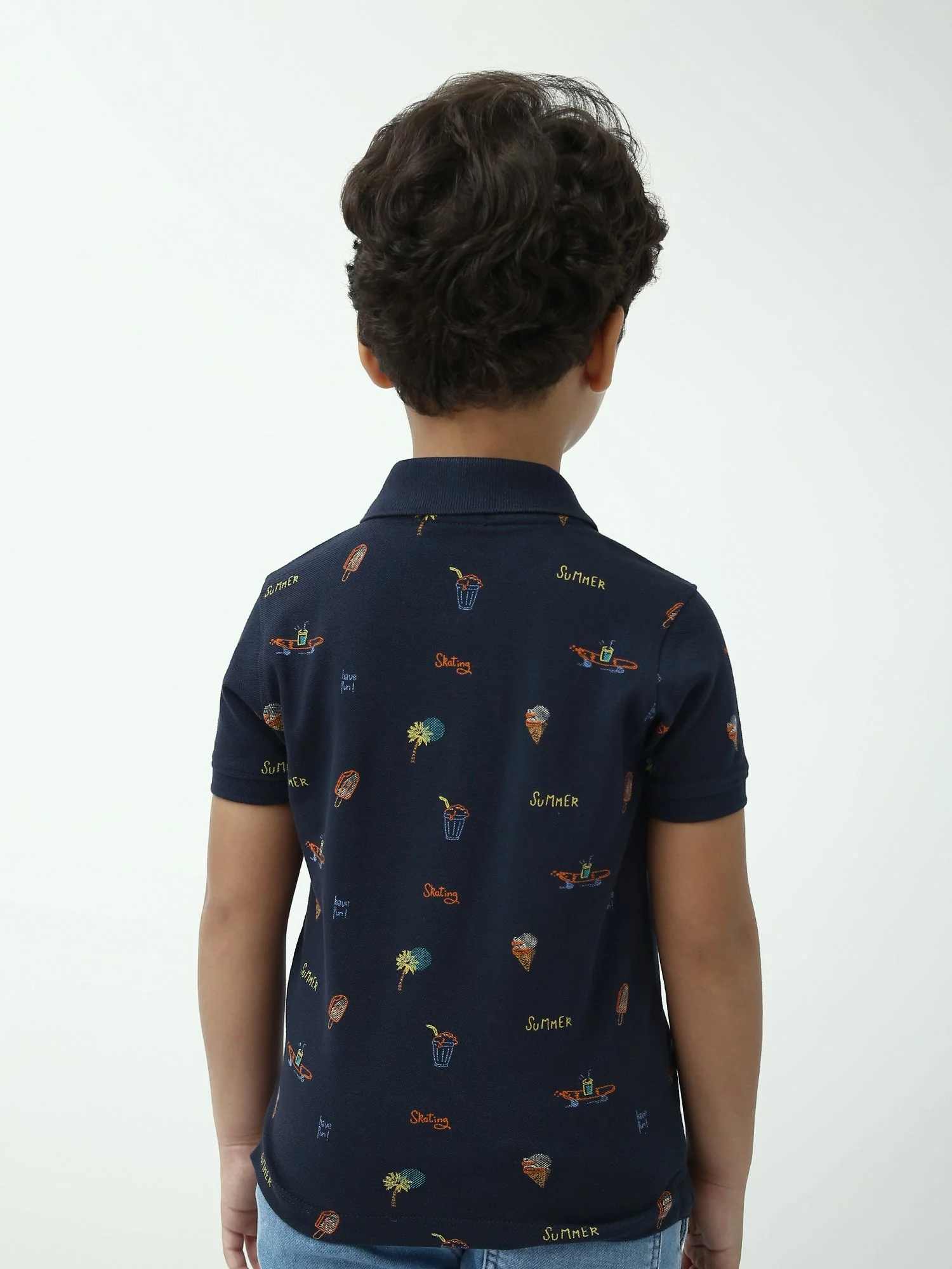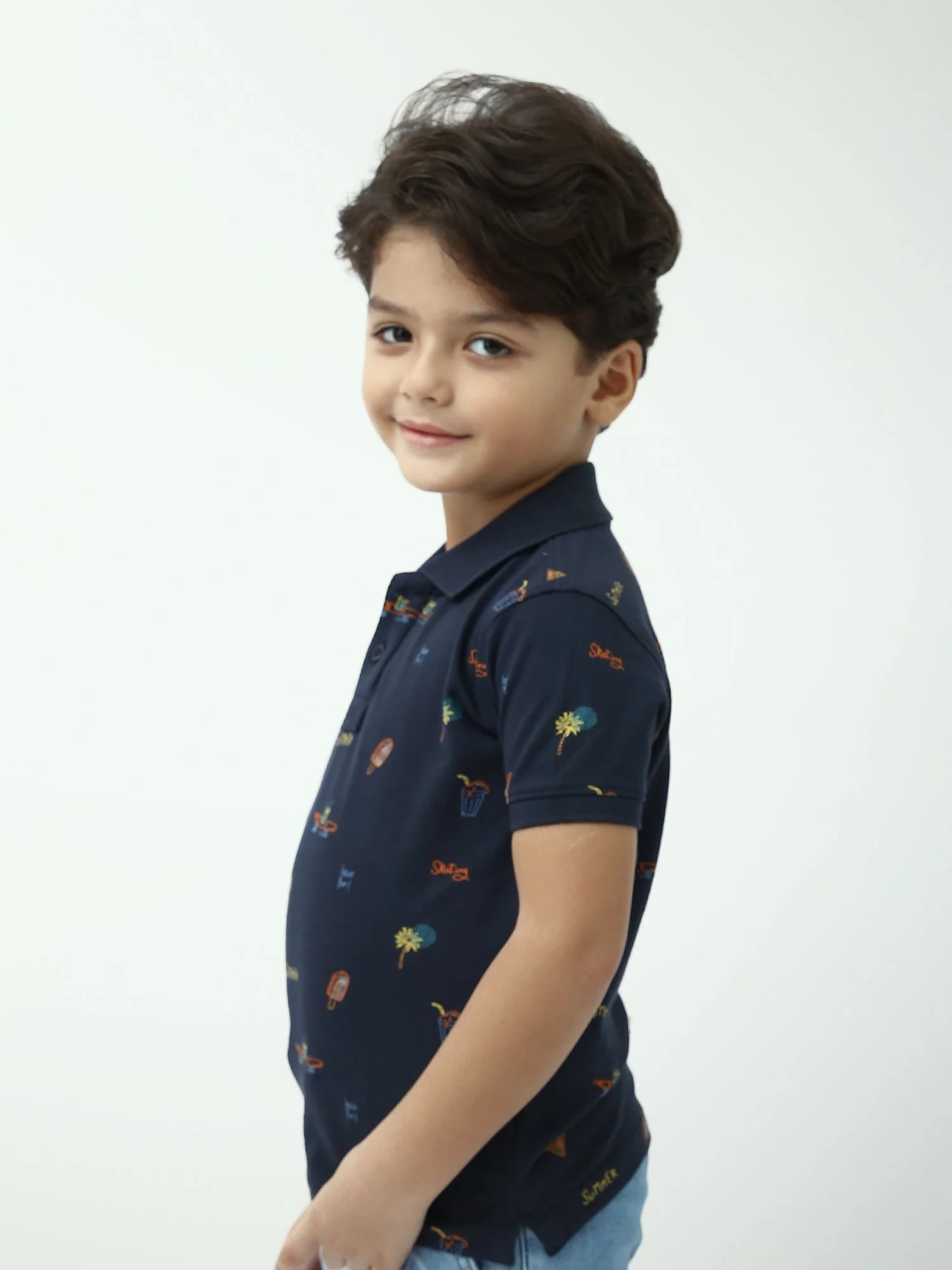 Ce polo garçon bleu marine est un indispensable de l’été, à la fois confortable et tendance. Confectionné en maille piquée de style polo, il offre une sensation agréable et une bonne respirabilité, idéale pour les journées chaudes, l’école ou les sorties en famille. Son imprimé estival all-over apporte une touche fun et moderne : petits motifs inspirés des vacances (glaces, palmiers et détails “summer”) pour un look plein d’énergie.