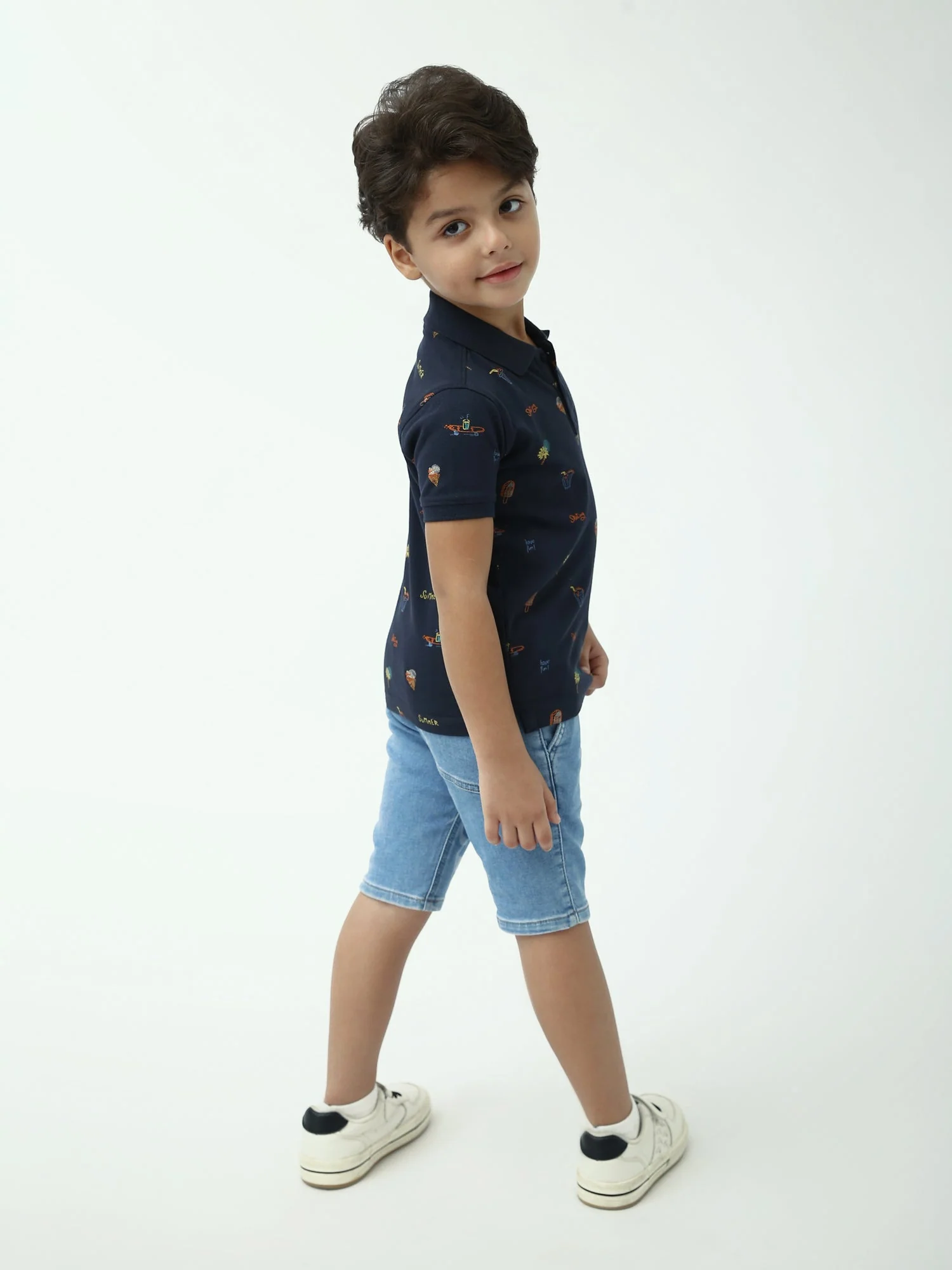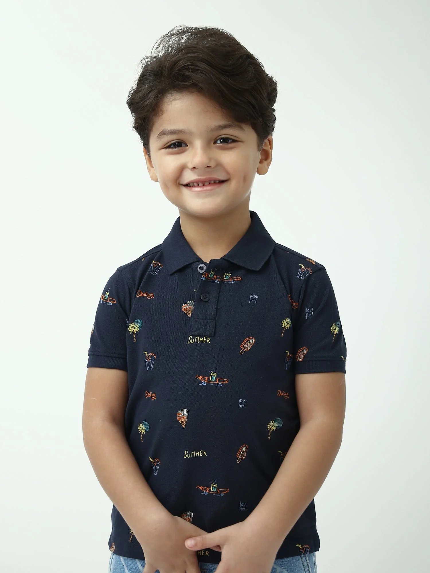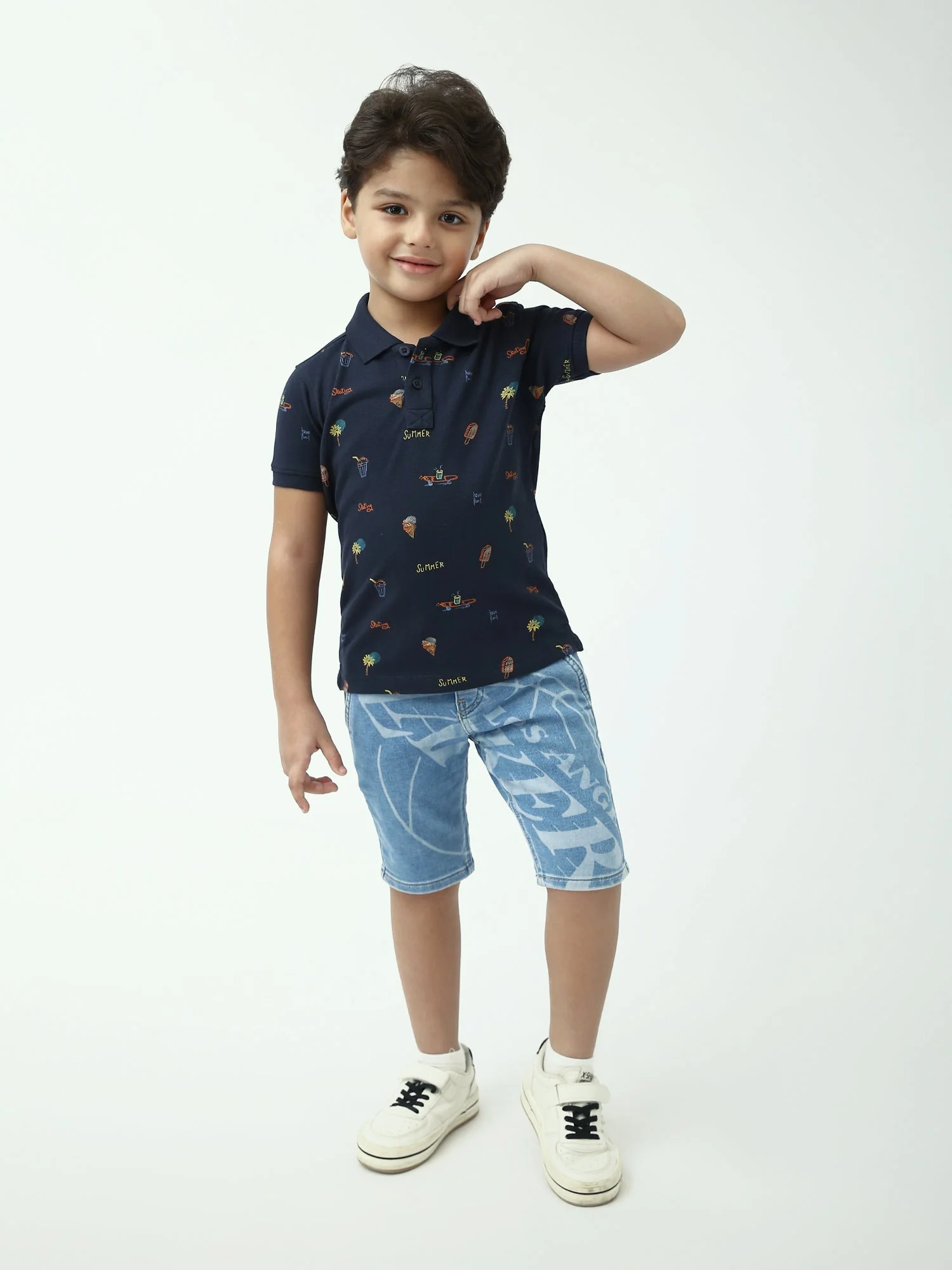 Ce polo garçon bleu marine est un indispensable de l’été, à la fois confortable et tendance. Confectionné en maille piquée de style polo, il offre une sensation agréable et une bonne respirabilité, idéale pour les journées chaudes, l’école ou les sorties en famille. Son imprimé estival all-over apporte une touche fun et moderne : petits motifs inspirés des vacances (glaces, palmiers et détails “summer”) pour un look plein d’énergie.