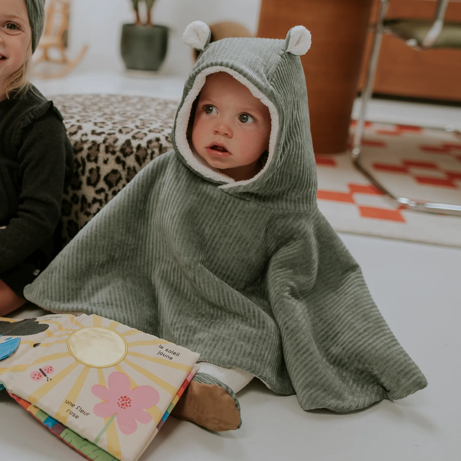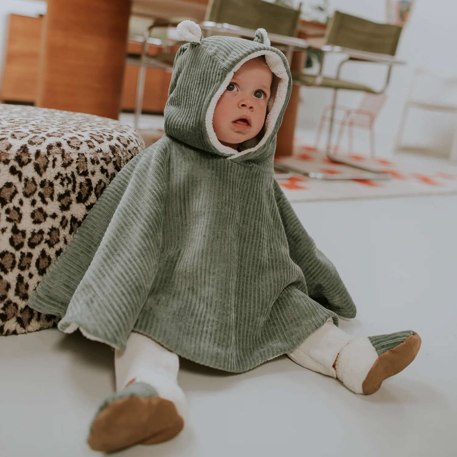 Confectionné dans un joli velours côtelé kaki, il séduit par son allure moderne et intemporelle. Sa texture douce et souple apporte une touche d’élégance, tandis que sa doublure en teddy ultra-doux enveloppe bébé d’une chaleur réconfortante. Cette combinaison de matières rend le poncho aussi agréable à porter que joli à regarder — un vrai petit nid de douceur !