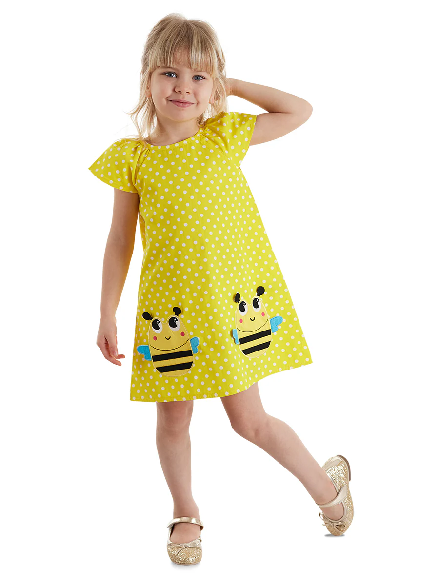 Cette robe fille est confectionnée en tissu popeline tissé, léger et agréable à porter. Son design chic et ludique est sublimé par un appliqué abeille original, parfait pour apporter une touche amusante aux tenues du quotidien.