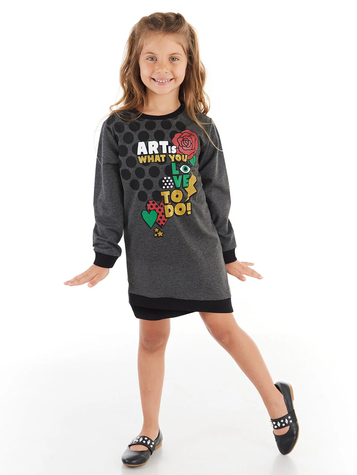 Cette robe fille Art Love est confectionnée en tissu coton de moyenne épaisseur, idéale pour la saison hivernale. Sa coupe élégante avec une jupe taillée en biais apporte un tombé fluide et confortable, parfaitement adapté au quotidien des enfants.