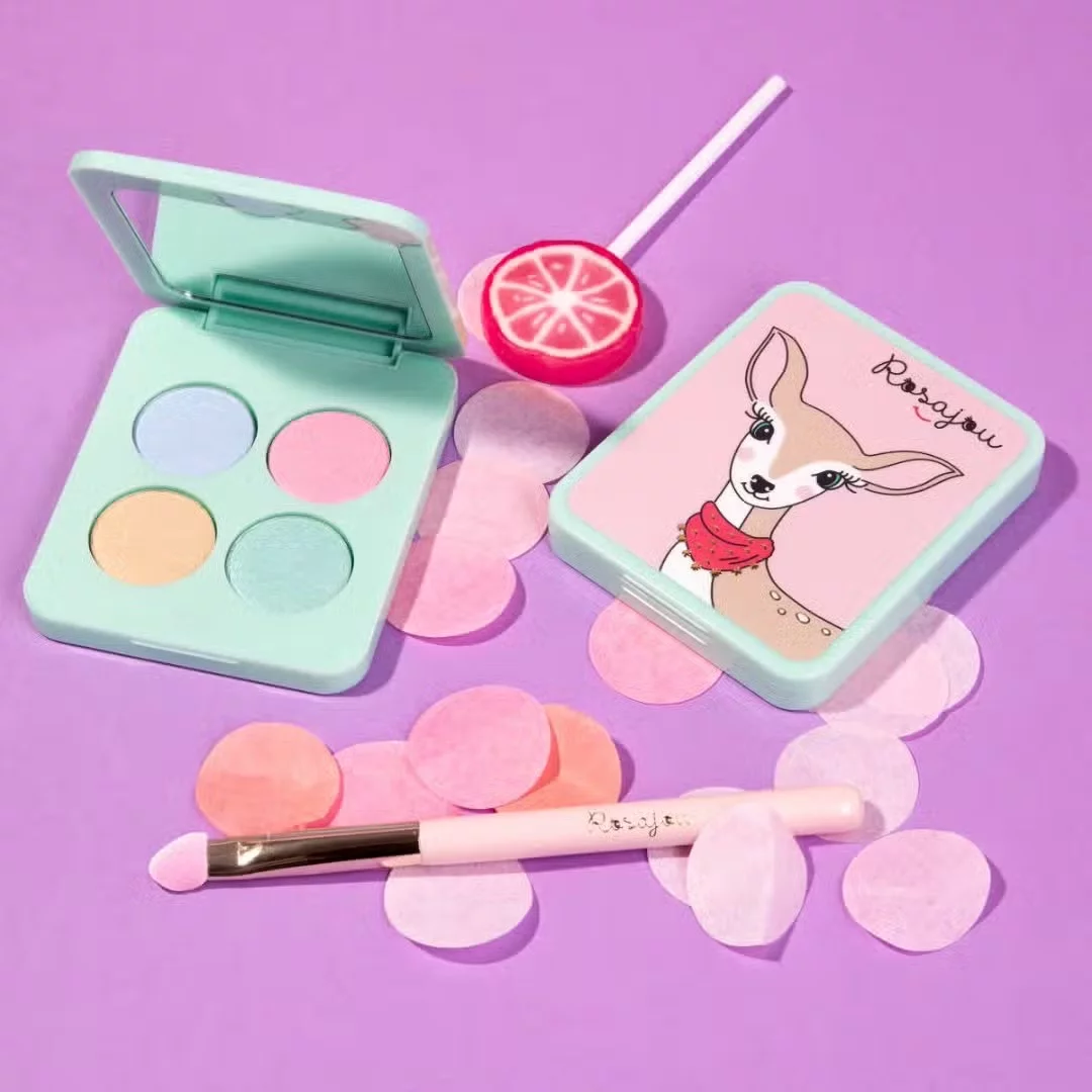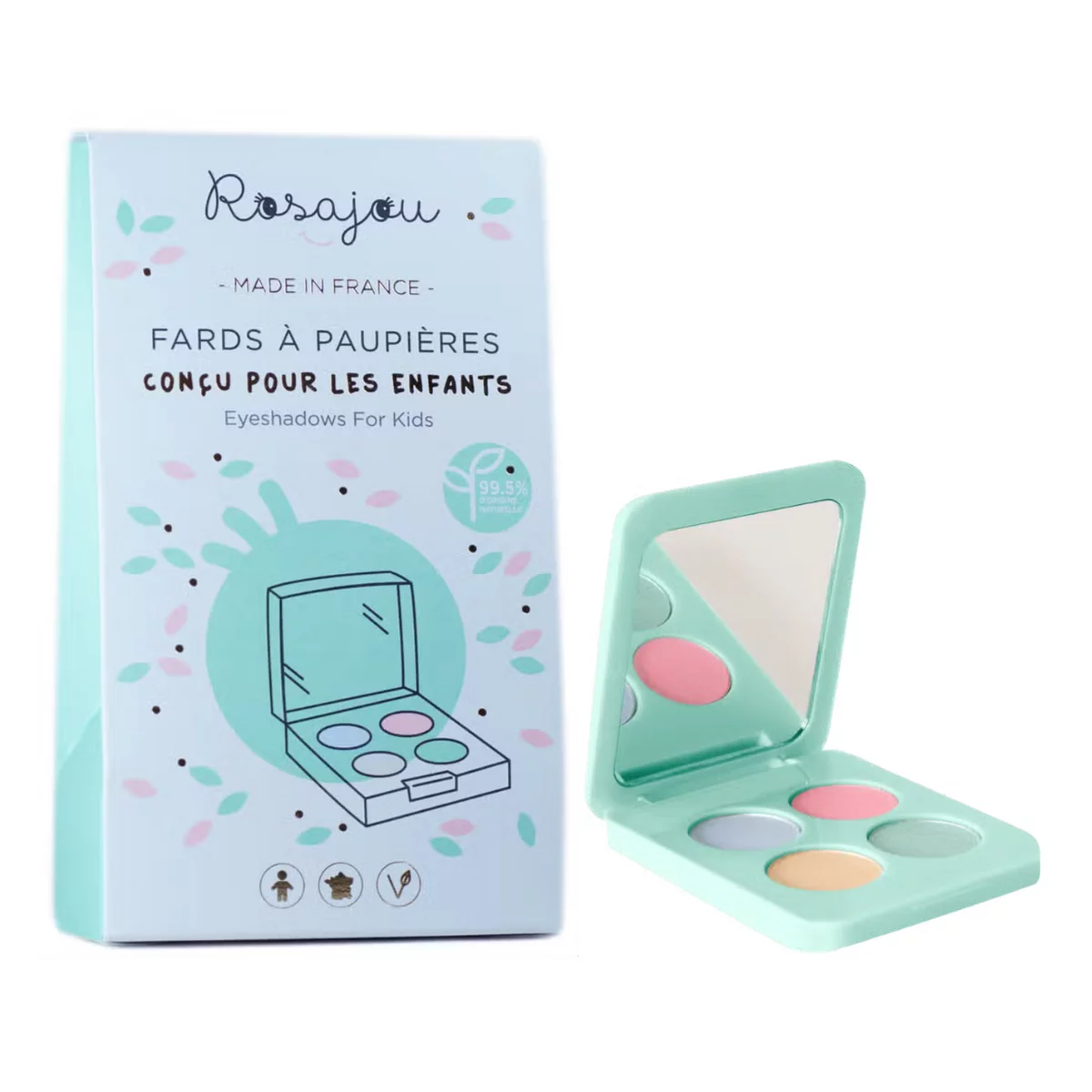 4 fards à paupières pour les jolis yeux des coquettes : rose, doré, bleu et vert. Une formule très douce à base de talc et de nacres minérales. VEGAN Dédié aux enfants. Testé sous contrôle dermatologique. Fabriqué en France. Boîtier en plastique vert avec miroir – poudre : 4 X 0,03 oz/4 x 1,5 g