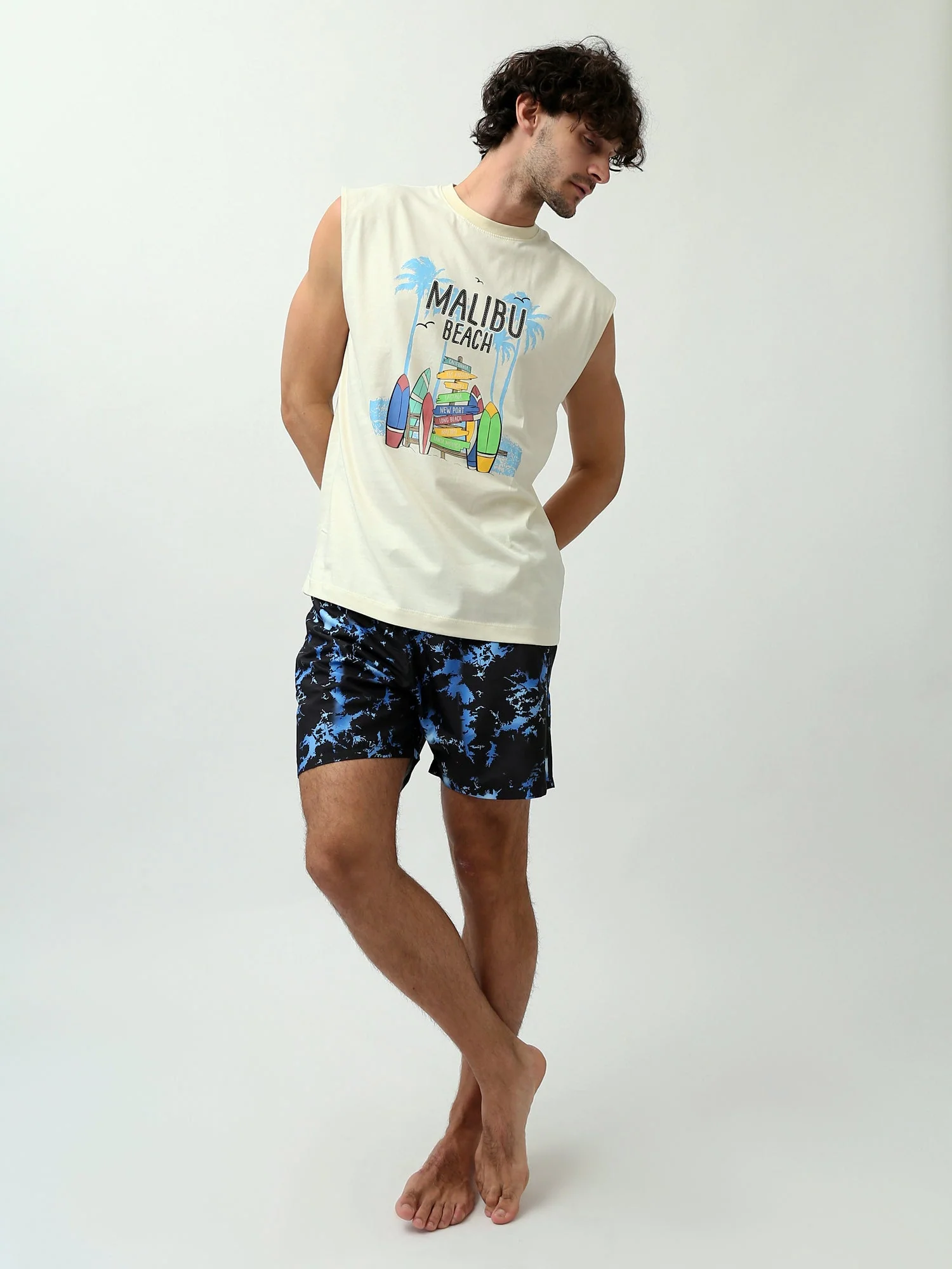 Short de bain homme à motif tropical avec taille élastique et cordon de serrage – SWO24SSAE11409TM1