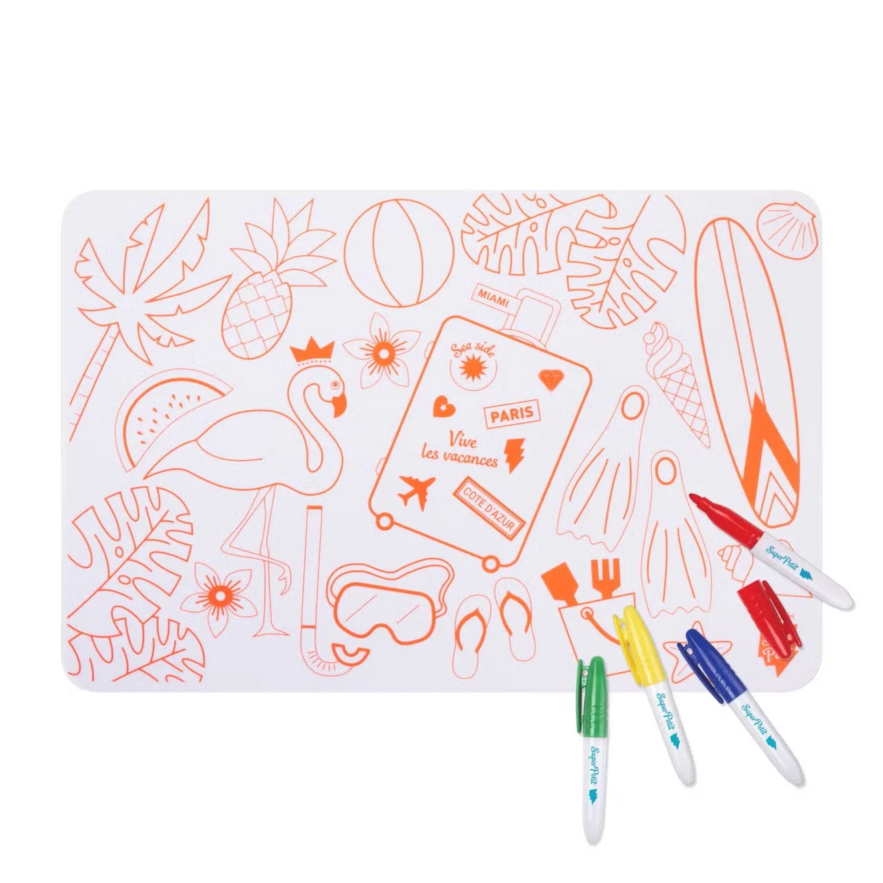 Imaginez-vous en train de préparer la valise pour des vacances en famille. Au programme : plages ensoleillées, boissons délicieuses sous les palmiers et moments inoubliables partagés avec vos enfants. Pour rendre ces moments encore plus magiques et sans stress, ce set réversible en silicone est l’outil idéal pour occuper vos petits artistes en herbe. Composé d’un tapis en silicone et de quatre feutres colorés, ce produit est pensé pour stimuler la créativité des enfants à partir de trois ans.