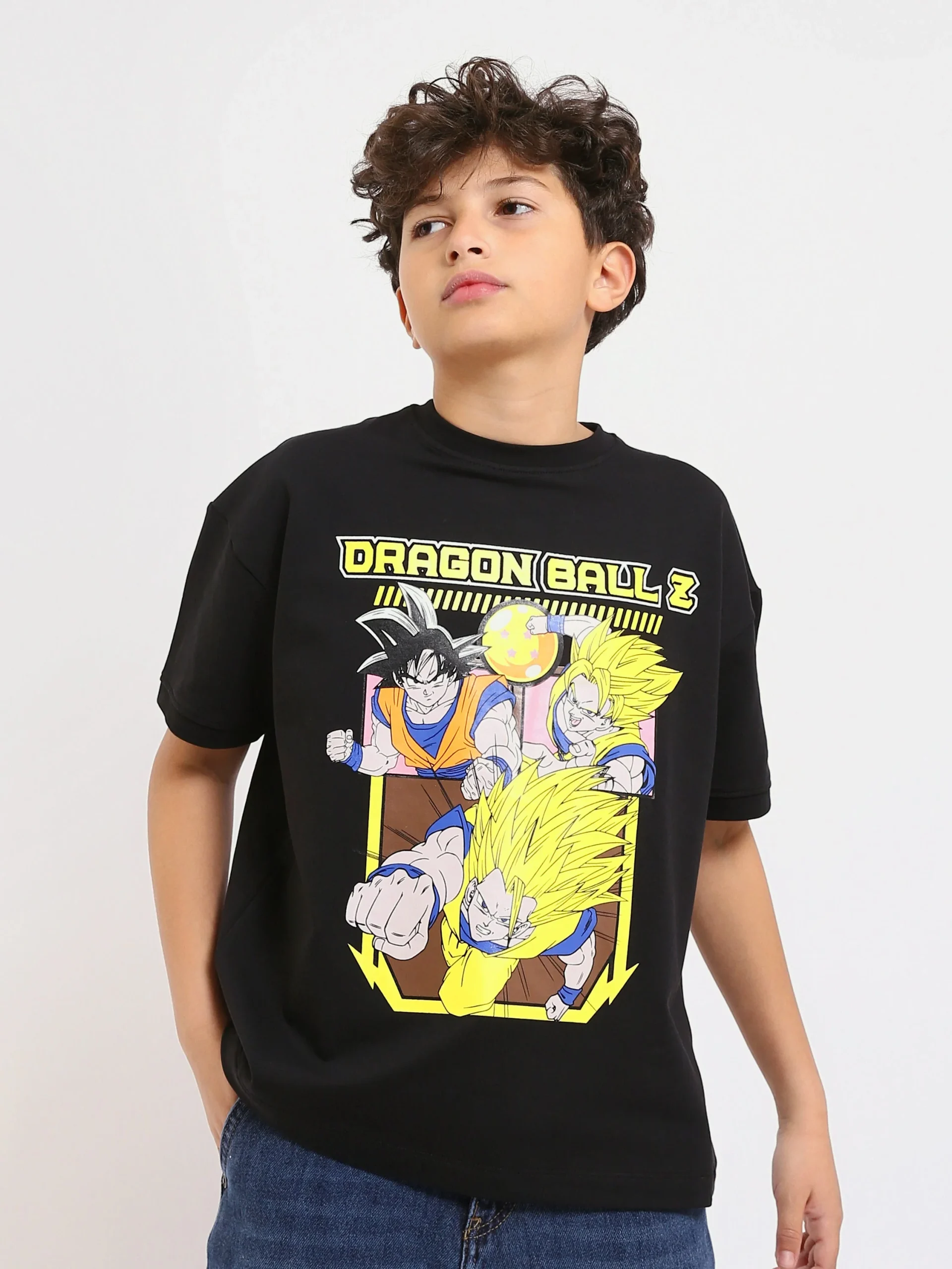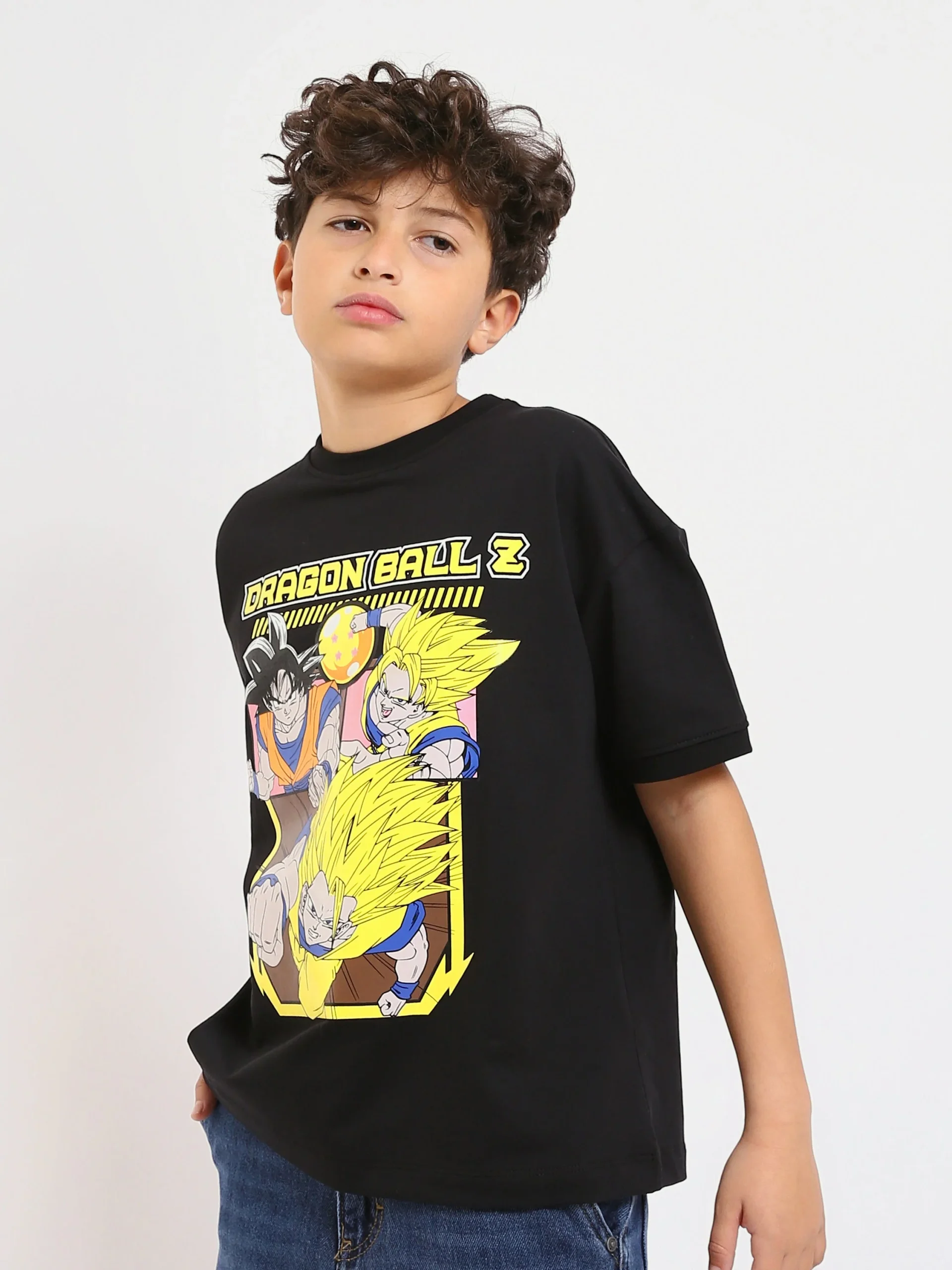 T-shirt enfant garçon au design moderne inspiré de l’univers Dragon Ball Z, idéal pour les fans d’animé et d’actions épiques. Il se décline dans une couleur noire pratique, avec un imprimé cartoon coloré et marqué qui apporte une touche dynamique et attractive au look de l’enfant.
