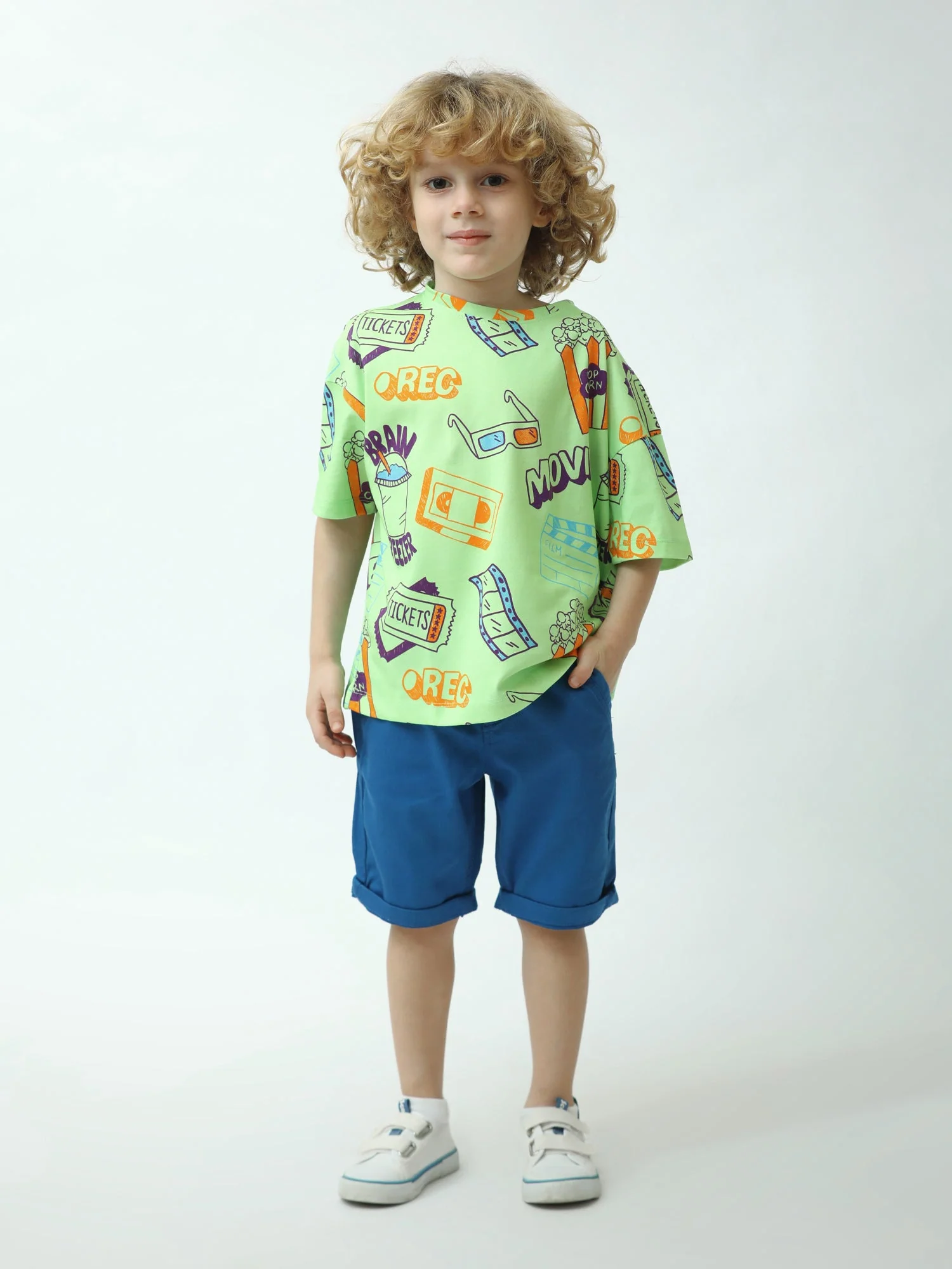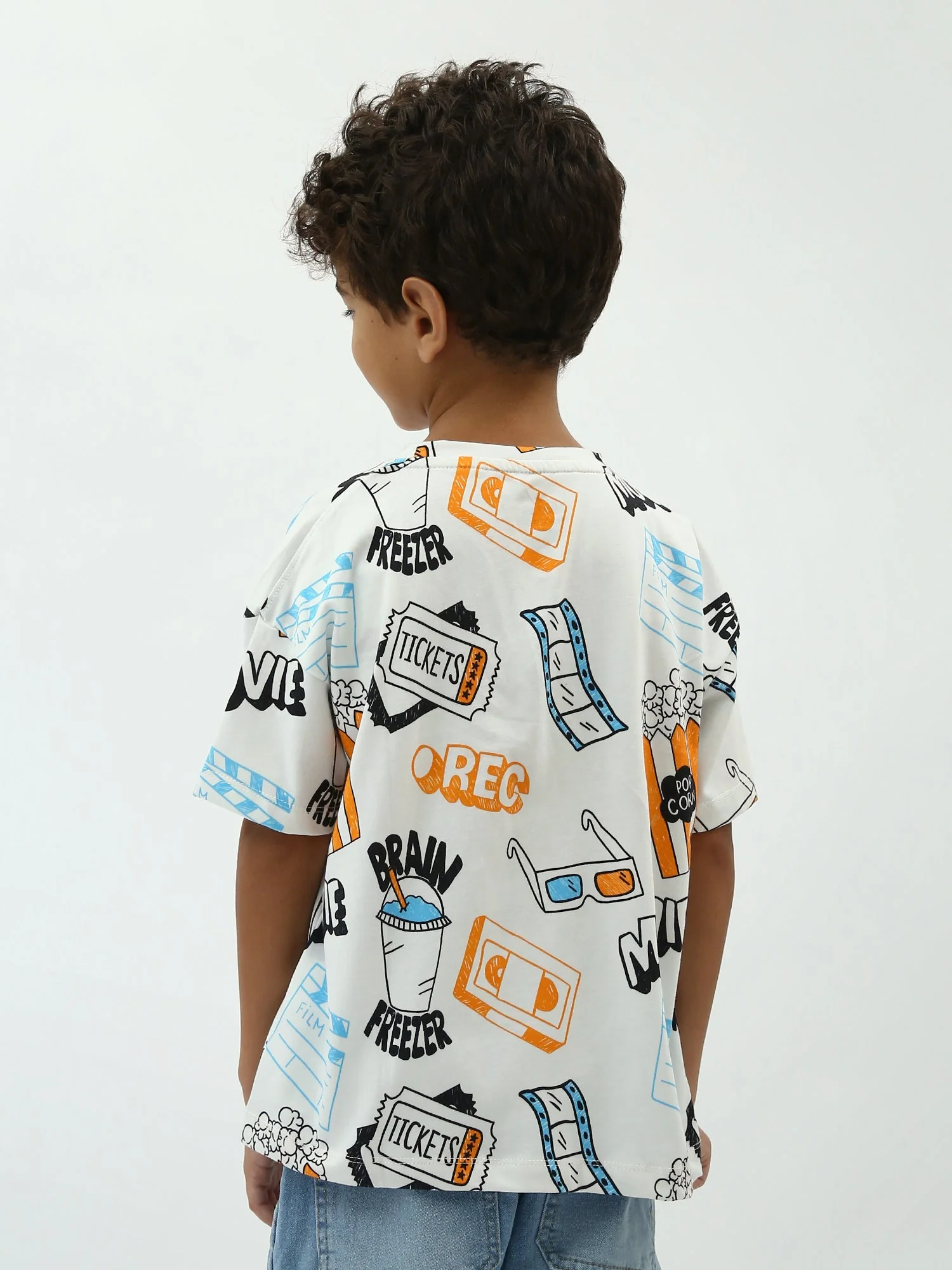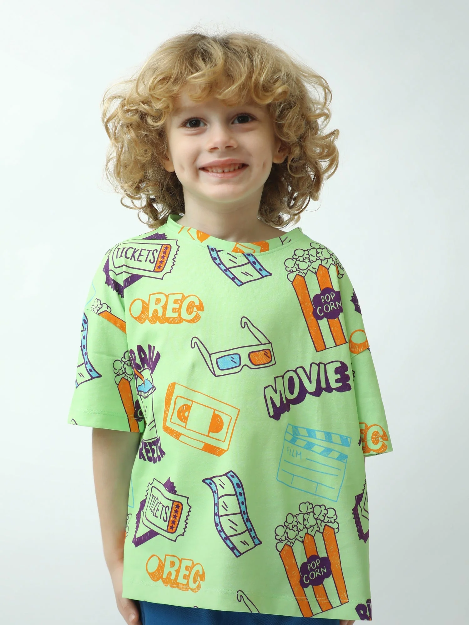 T-shirt garçon fun et tendance, parfait pour les fans de films. Son imprimé all-over inspiré de l’univers du cinéma (popcorn, tickets, lunettes 3D, pellicule, clap…) apporte une touche originale au look des enfants. Coupe confortable et agréable à porter au quotidien, idéale pour l’école, les sorties et les vacances.