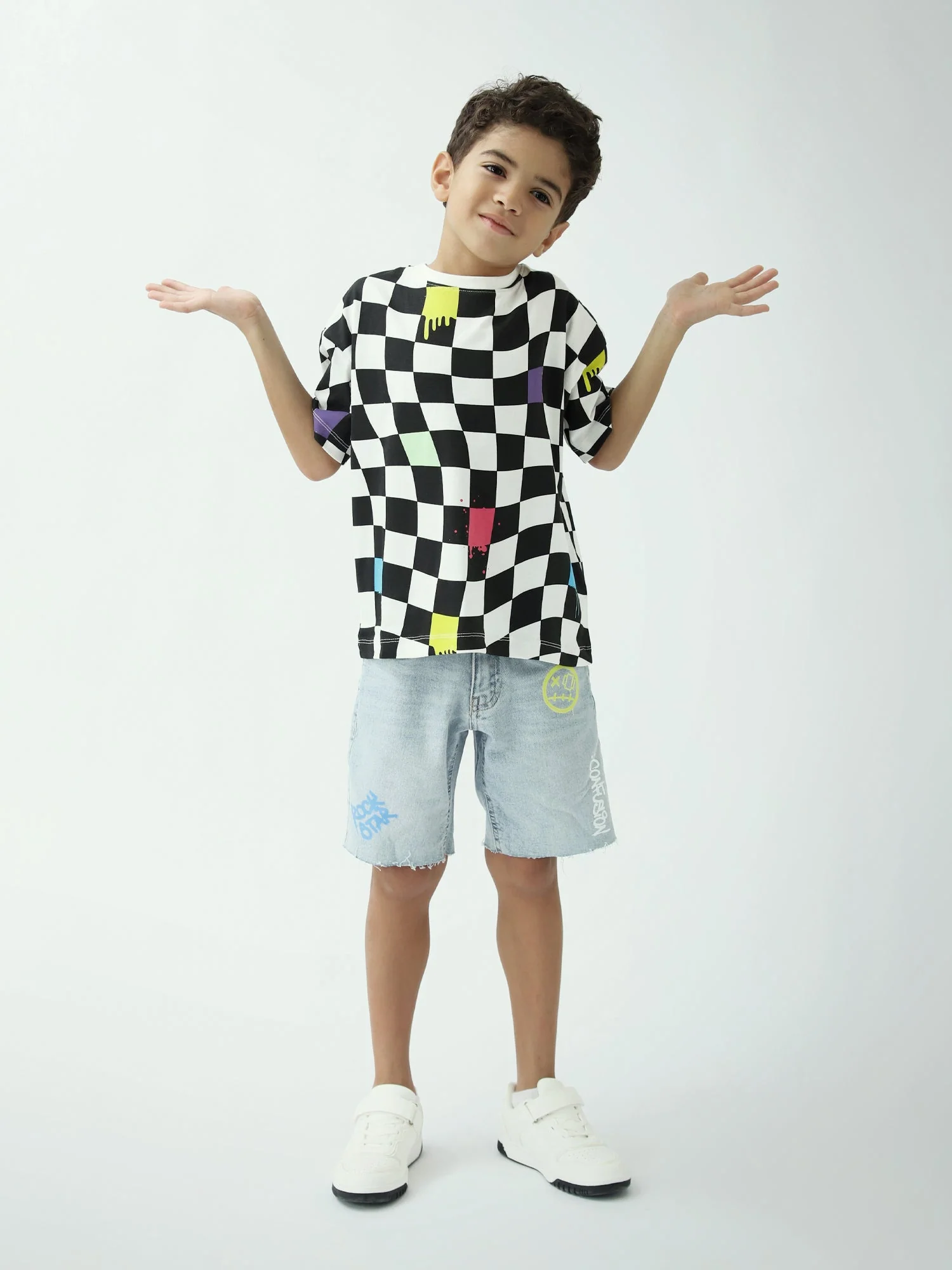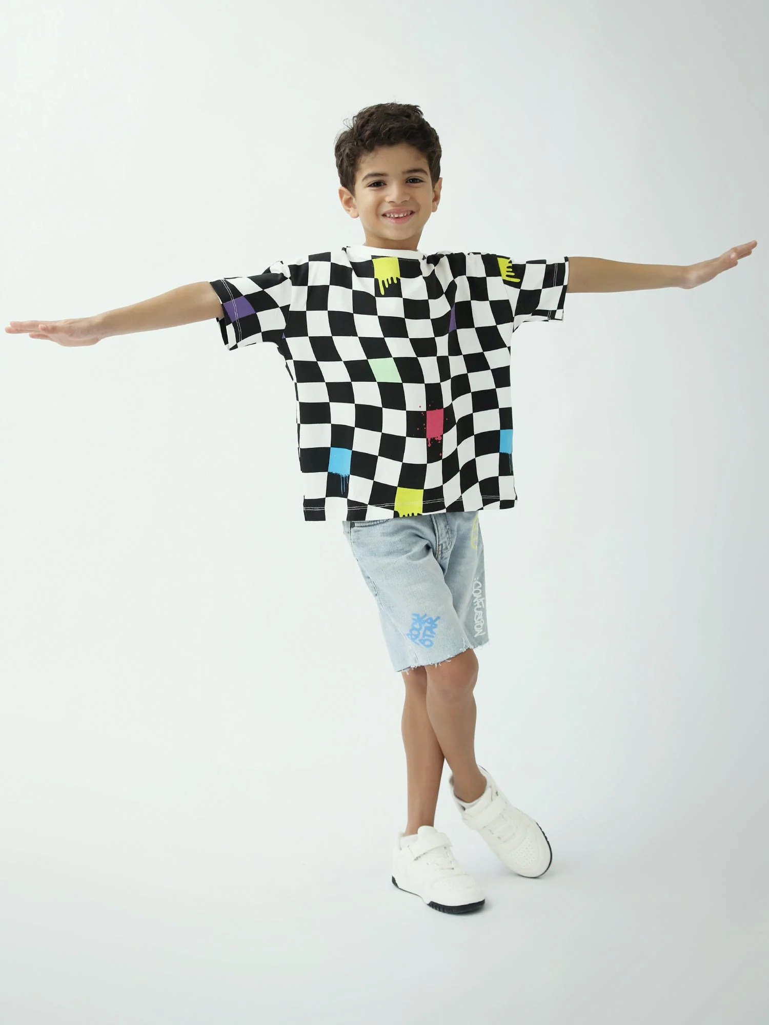 Un t-shirt tendance pour garçon avec un imprimé damier noir et blanc rehaussé de touches colorées, parfait pour un look streetwear. Léger et agréable à porter au quotidien, il s’associe facilement avec un jean, un short ou un pantalon cargo. Couleurs : noir & blanc (touches colorées) Manches courtes, col rond Imprimé damier moderne Coupe […]