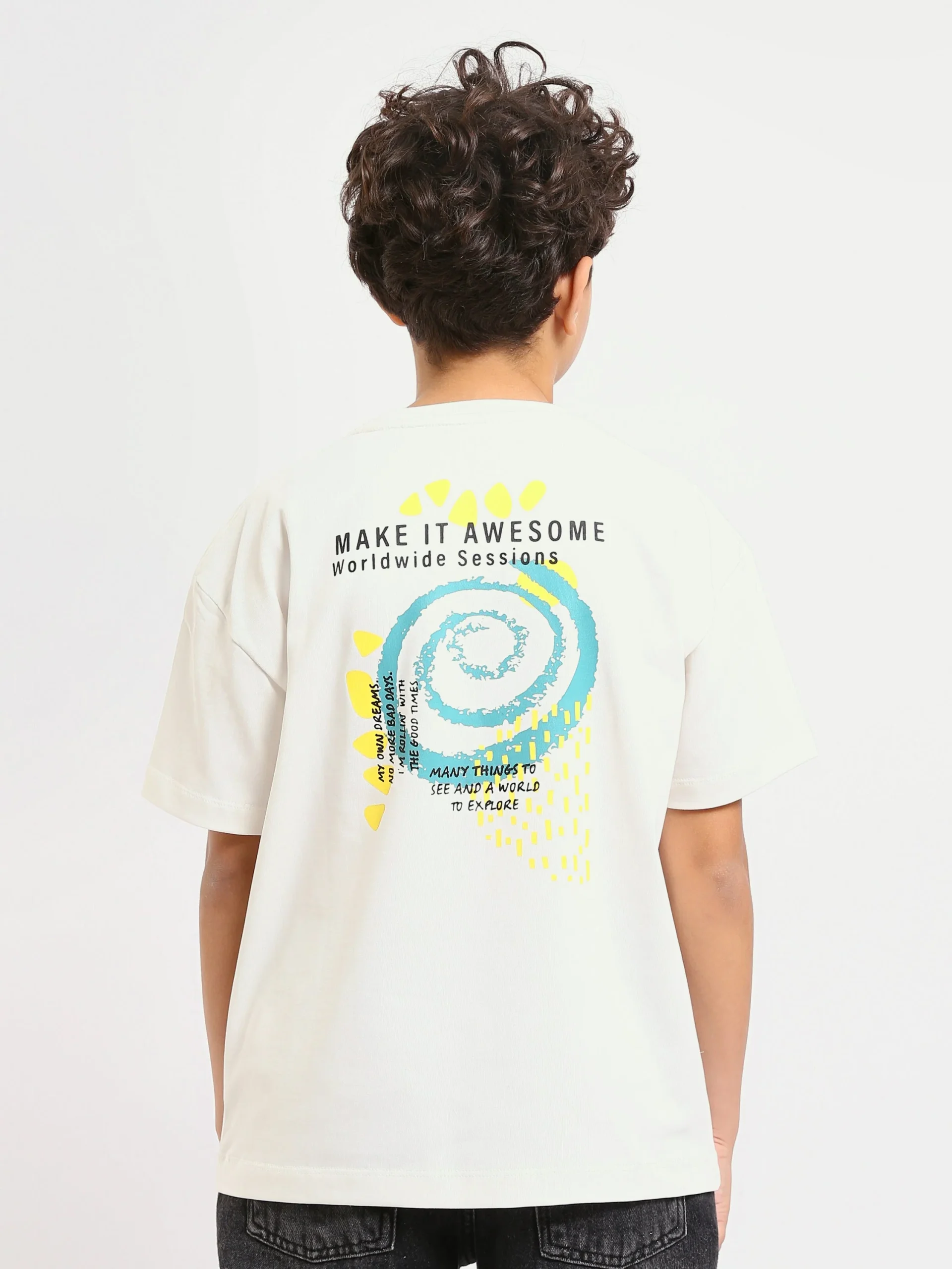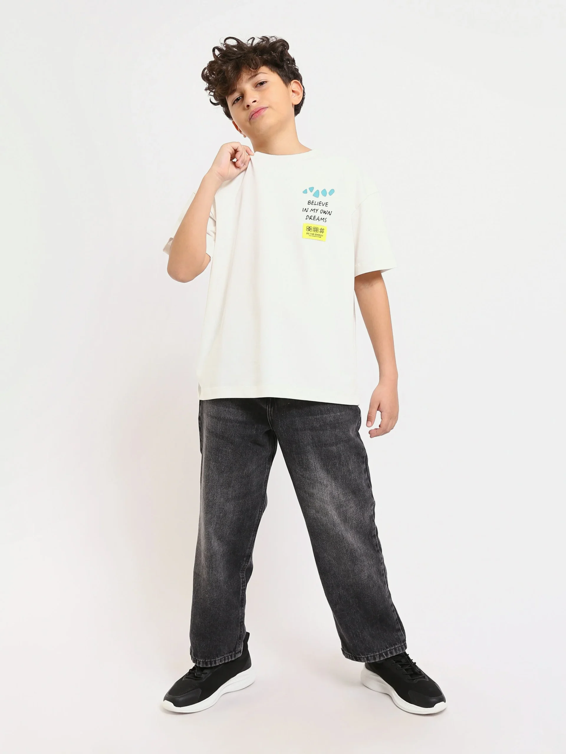 Ce t-shirt pour garçon combine confort et style avec son design inspirant et ses couleurs vives. Il arbore un imprimé unique avec le message « Believe in My Own Dreams » accompagné de motifs colorés, parfait pour encourager les jeunes à poursuivre leurs rêves. Fabriqué en coton doux, ce t-shirt assure un confort optimal pour toute la journée. Le dos présente un design dynamique avec un motif en spirale et un message motivant, parfait pour un look cool et inspirant. Ce t-shirt est idéal pour les sorties décontractées ou les moments de détente.