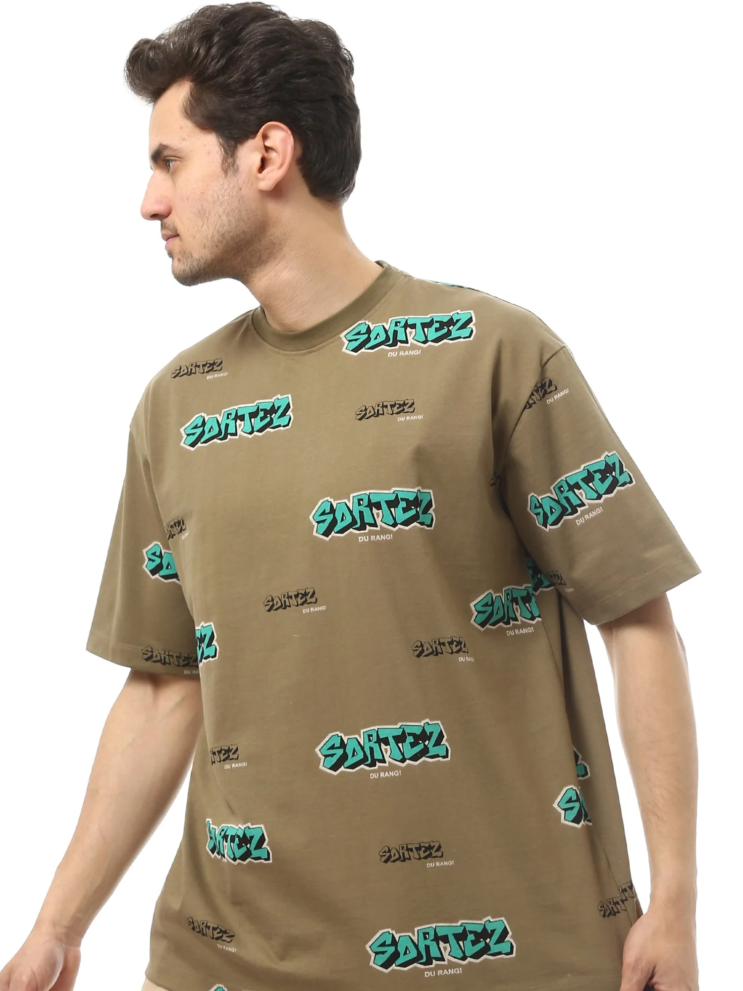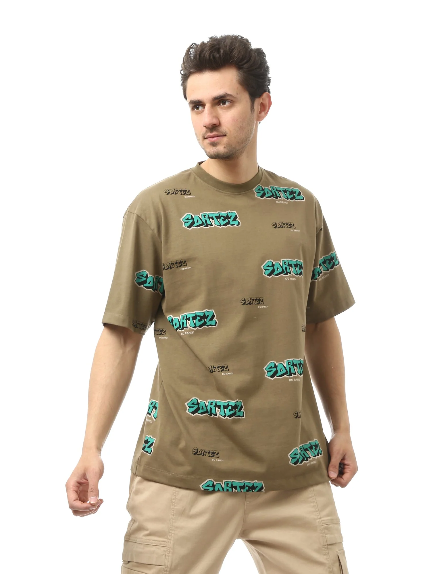 T-shirt homme moderne de couleur olive, avec un imprimé graffiti sur l’ensemble du tissu. Il se distingue par sa coupe confortable et ses manches courtes, idéales pour les looks décontractés, ce qui le rend parfait pour les activités quotidiennes ou les sorties spontanées. Confectionné en coton, il assure un confort optimal tout au long de la journée, tandis que l’imprimé graffiti apporte une touche jeune et tendance. Facile à assortir avec un jean ou un short pour un style distinctif et attrayant, il convient parfaitement aux saisons estivale et printanière.