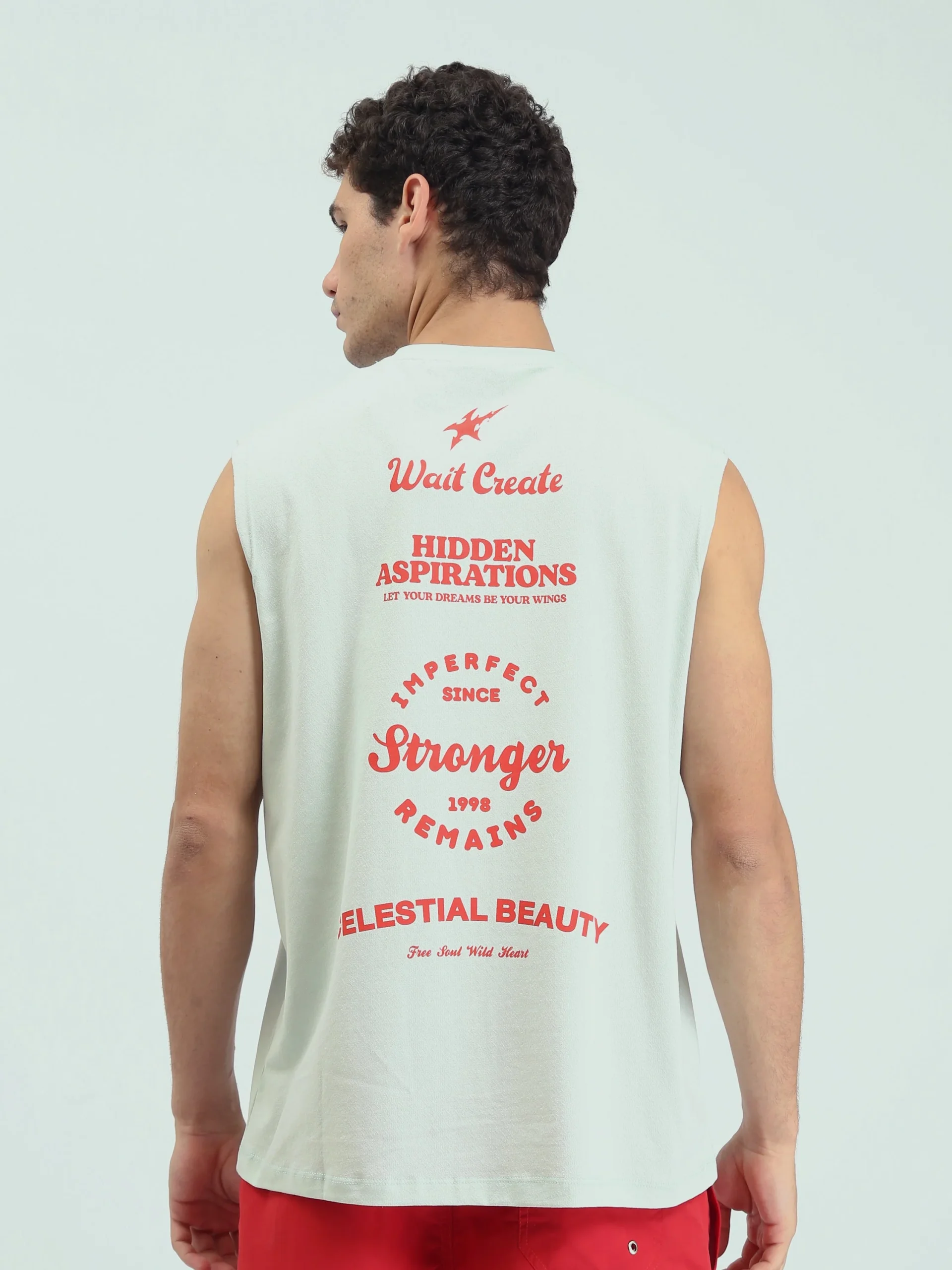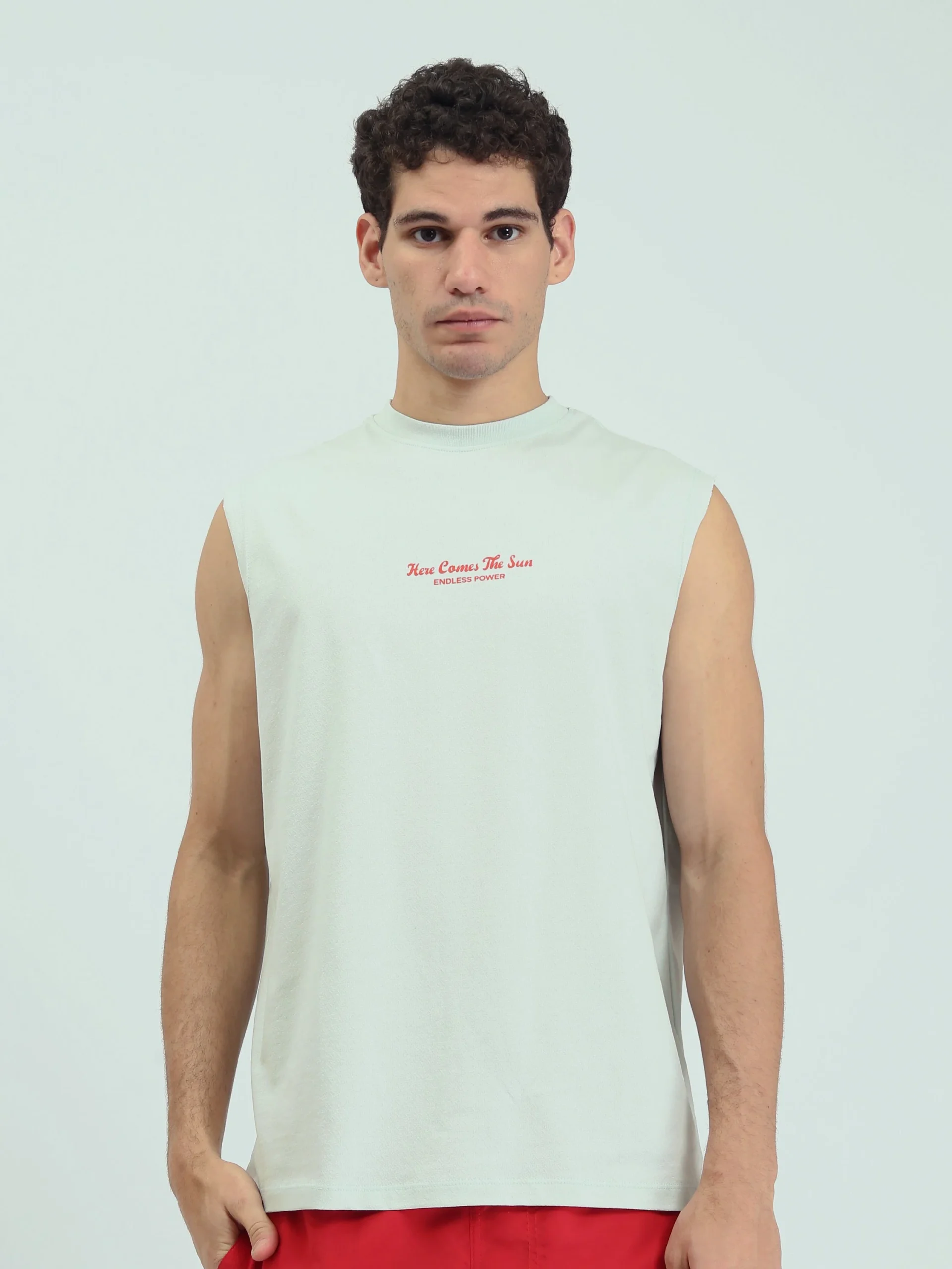 T-shirt homme sans manches au design moderne, alliant confort et esprit jeune. Il se distingue par une petite impression sur le devant et une touche audacieuse grâce à une grande impression au dos avec des textes contemporains, apportant une forte personnalité à la tenue.