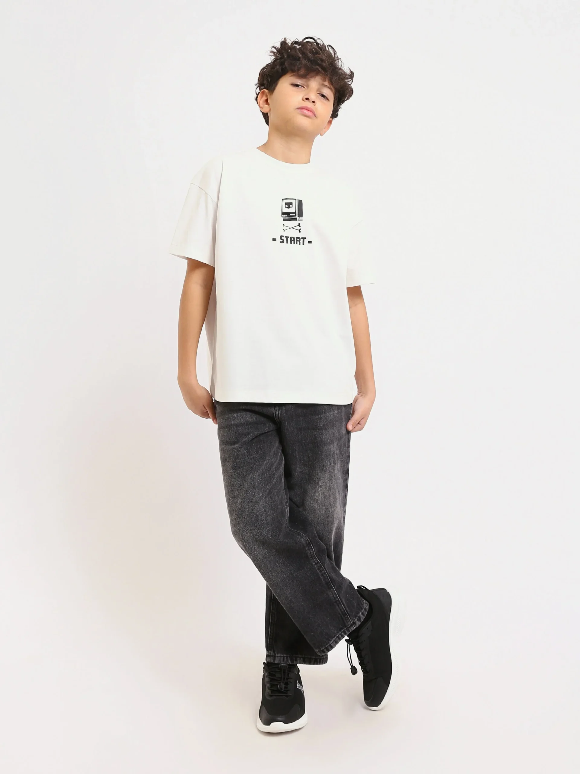 Ce t-shirt oversized pour garçon, de couleur blanc cassé, présente un design rétro inspiré des premières consoles de jeu vidéo. L’imprimé « START » au centre de la poitrine, accompagné d’une illustration de console, donne un look dynamique et tendance. Parfait pour les jeunes passionnés de jeux vidéo et de mode décontractée, ce t-shirt combine confort et style. Sa coupe ample assure une liberté de mouvement tout au long de la journée.